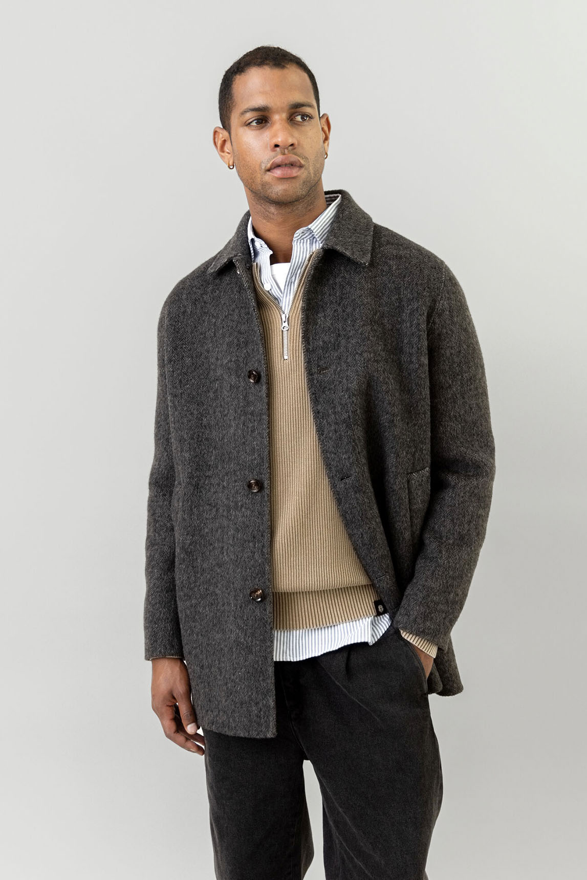 - Abrigo de corte recto y largo medio.