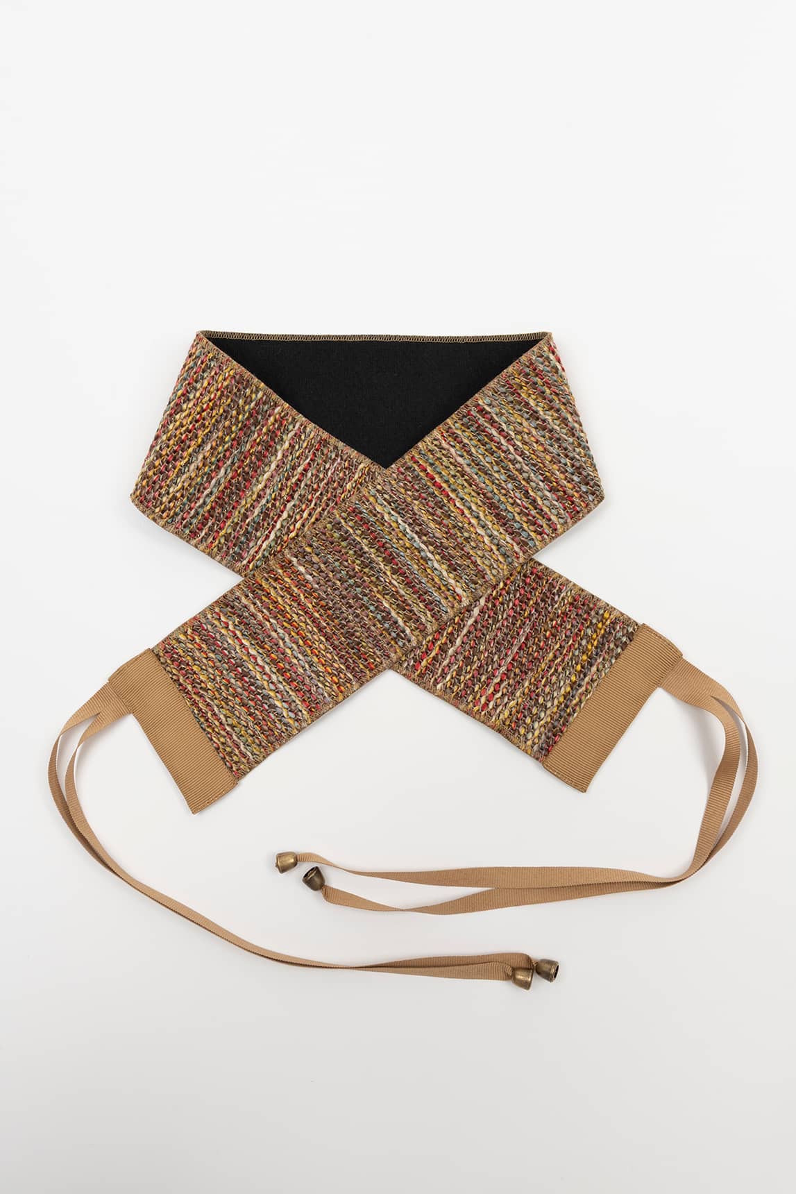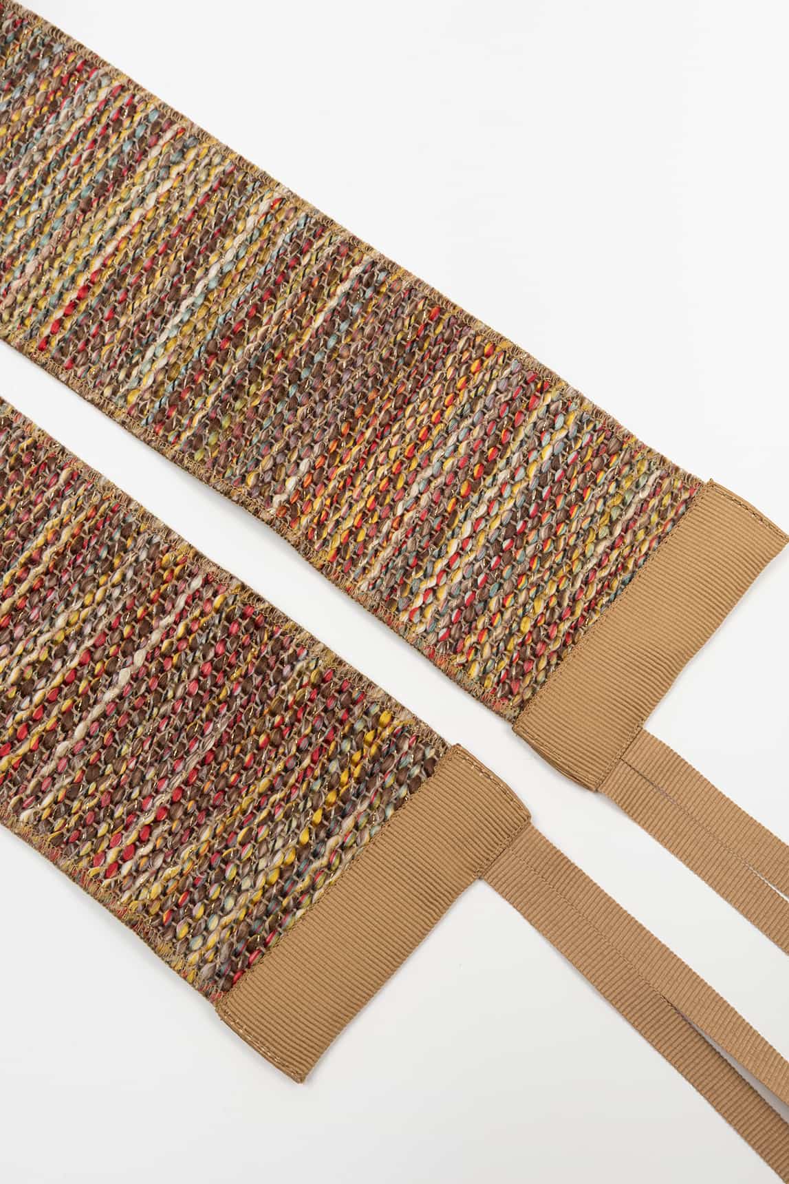 Este fajín es pura energía para tus looks de otoño e invierno. Confeccionado en un tejido trenzado multicolor que mezcla hilos mostaza, rojo, marrón, beige y azul, aporta vida y textura a cualquier conjunto. El interior forrado en negro garantiza una sujeción cómoda, mientras que las cintas de grosgrain en color camel, con terminales metálicos, permiten ajustarlo fácilmente a la cintura. Ideal para dar un giro original a vestidos, jerséis o abrigos en tonos neutros.