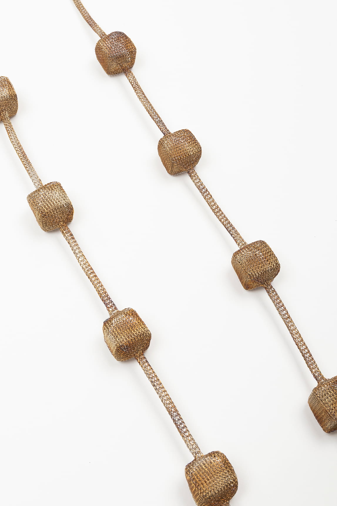 - Cuentas geométricas recubiertas de la misma malla, creando un efecto elegante y luminoso.