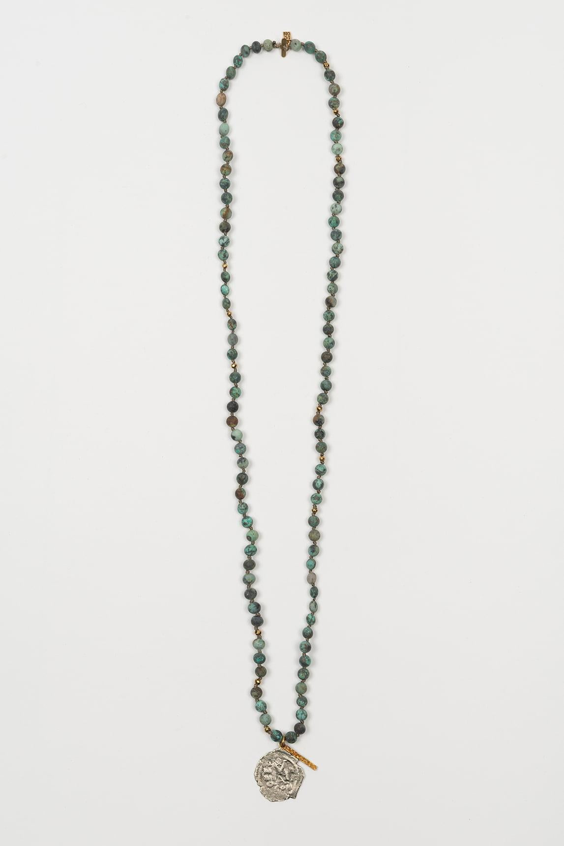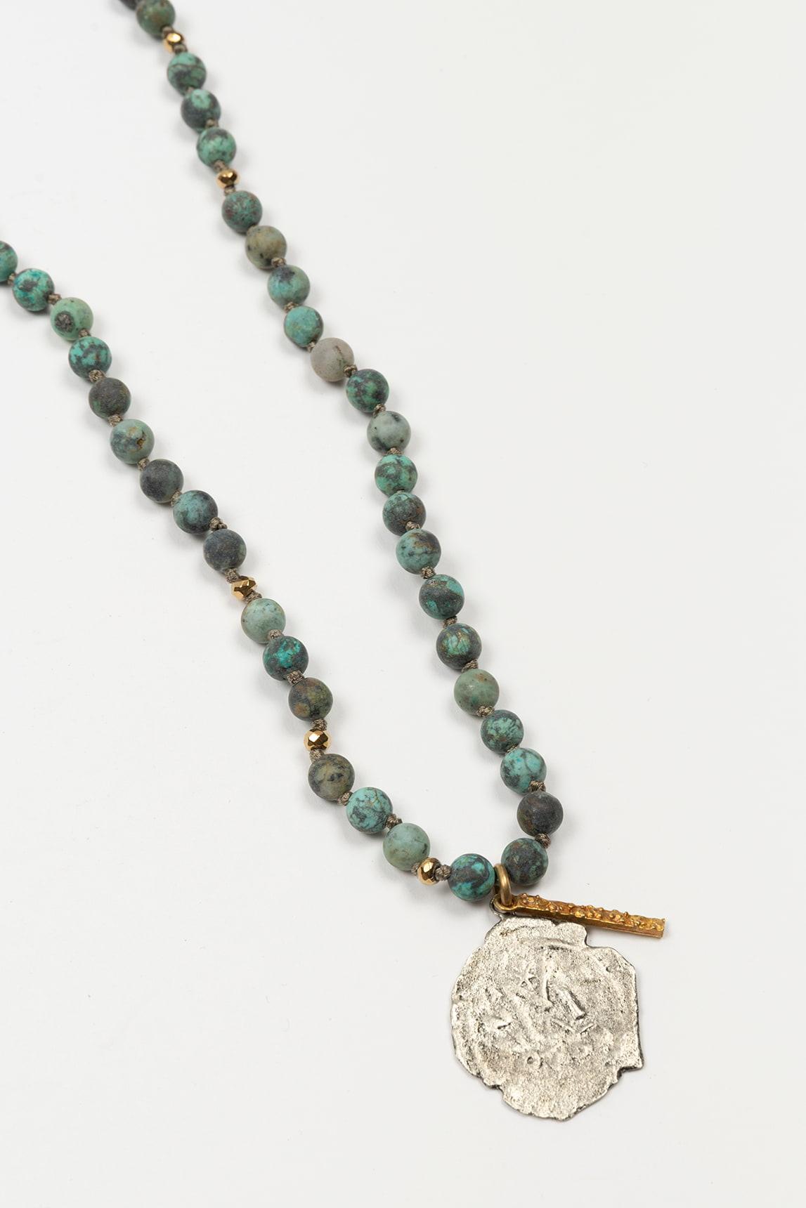 Collar de mujer con cuentas en tono turquesa de acabado irregular y pequeñas piezas metálicas intercaladas. El diseño se completa con un colgante de forma orgánica en metal de aspecto texturizado, acompañado por una barra decorativa que refuerza su carácter artesanal. La combinación de tonos crea una pieza luminosa, con movimiento y un aire natural muy equilibrado.