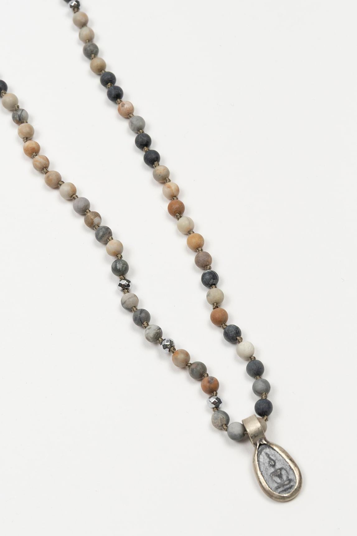 Collar de mujer con cuentas en tonos multicolor que combinan matices neutros, tierra y grisáceos, intercaladas con pequeñas piezas metálicas. El diseño se completa con un colgante ovalado de acabado texturizado enmarcado en metal, aportando un punto focal elegante y artesanal. La mezcla de colores crea una pieza equilibrada y muy combinable.