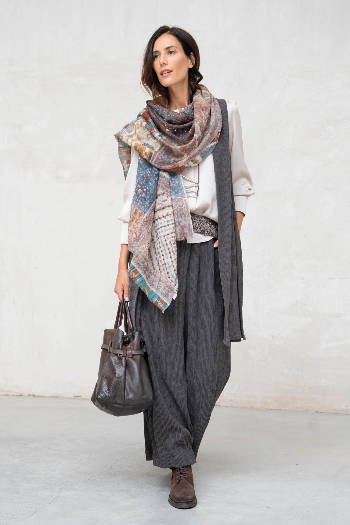 El fular patchwork de Rivera es una pieza especial con un estampado artístico tipo patchwork en tonos cálidos y terrosos. Elaborado en lana y seda se adorna con delicados toques de hilo metálico, abalorios y pequeños apliques brillantes, que aportan un efecto sutil de luz y sofisticación. Su textura suave y fluida permite lucirlo de difernetes maneras. Una pieza versátil y con carácter, ideal para dar un toque único a tus looks otoñales o de invierno.
