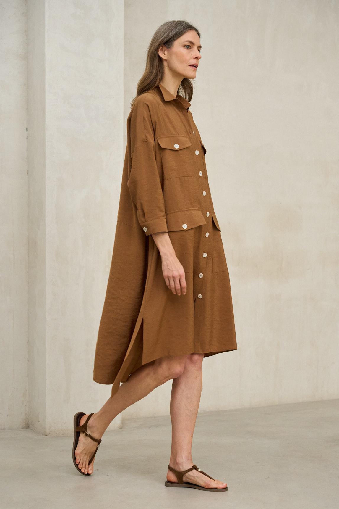 El vestido levita Maëron cobre es una pieza de inspiración utilitaria que combina estructura y fluidez en un diseño contemporáneo. Confeccionado en tejido ligero de tacto natural, presenta cuello camisero, cierre frontal con botones y bolsillos de plastrón con tapeta que refuerzan su carácter funcional.