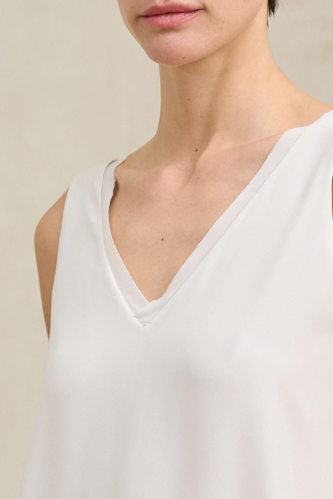 Este top sin mangas presenta una silueta amplia y ligera, definida por un escote en pico tanto en el delantero como en la espalda, que estiliza la parte superior y aporta una línea limpia y equilibrada. El tejido ofrece una caída fluida y continua, con un acabado liso que potencia la sensación de suavidad y movimiento. El bajo ligeramente redondeado refuerza su carácter relajado, mientras que el corte suelto permite que la prenda acompañe el cuerpo sin ajustarse.