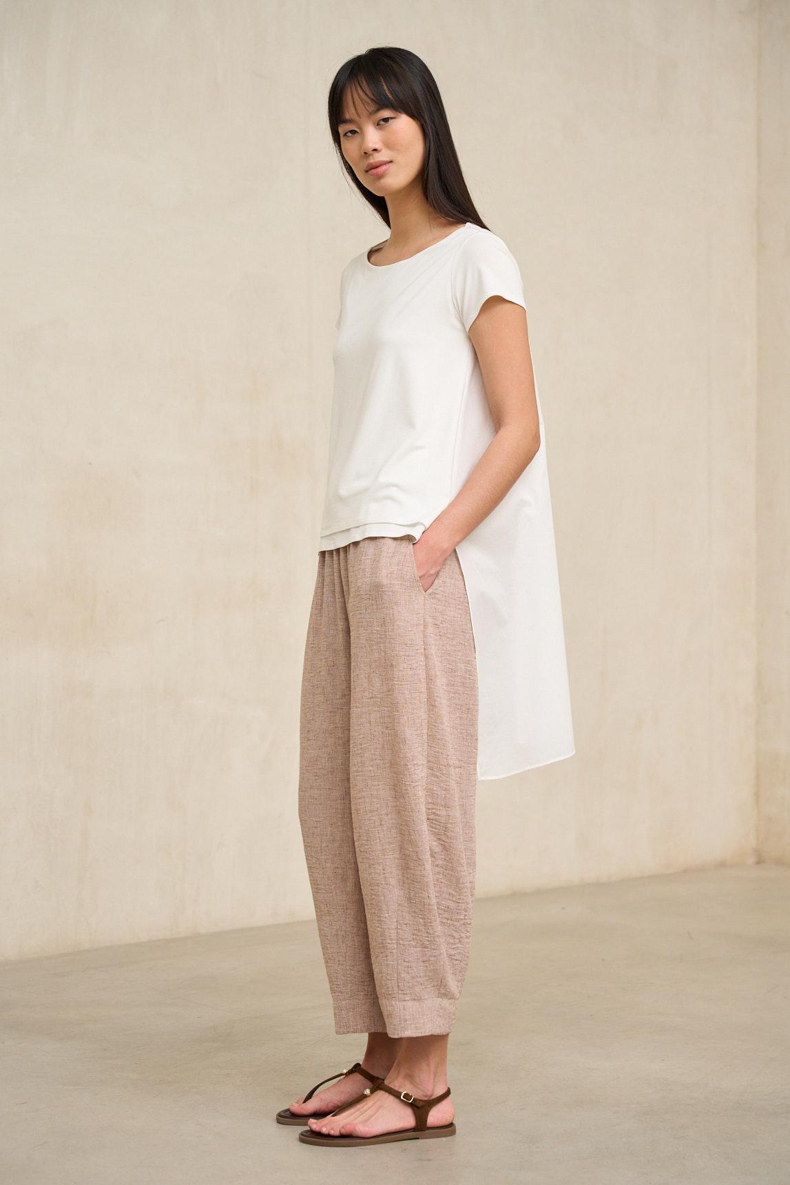 La camiseta Arnel blanco roto es una prenda esencial de líneas depuradas que combina sencillez y elegancia natural. Confeccionada en tejido suave y ligero, presenta una silueta recta con caída fluida que se adapta al cuerpo sin marcar, aportando comodidad y equilibrio visual. Su diseño incorpora escote redondo limpio y manga corta ligeramente suelta, creando una proporción armónica y fácil de llevar. La parte trasera es ligeramente más larga que el delantero, un detalle sutil que estiliza la silueta y aporta movimiento al conjunto.