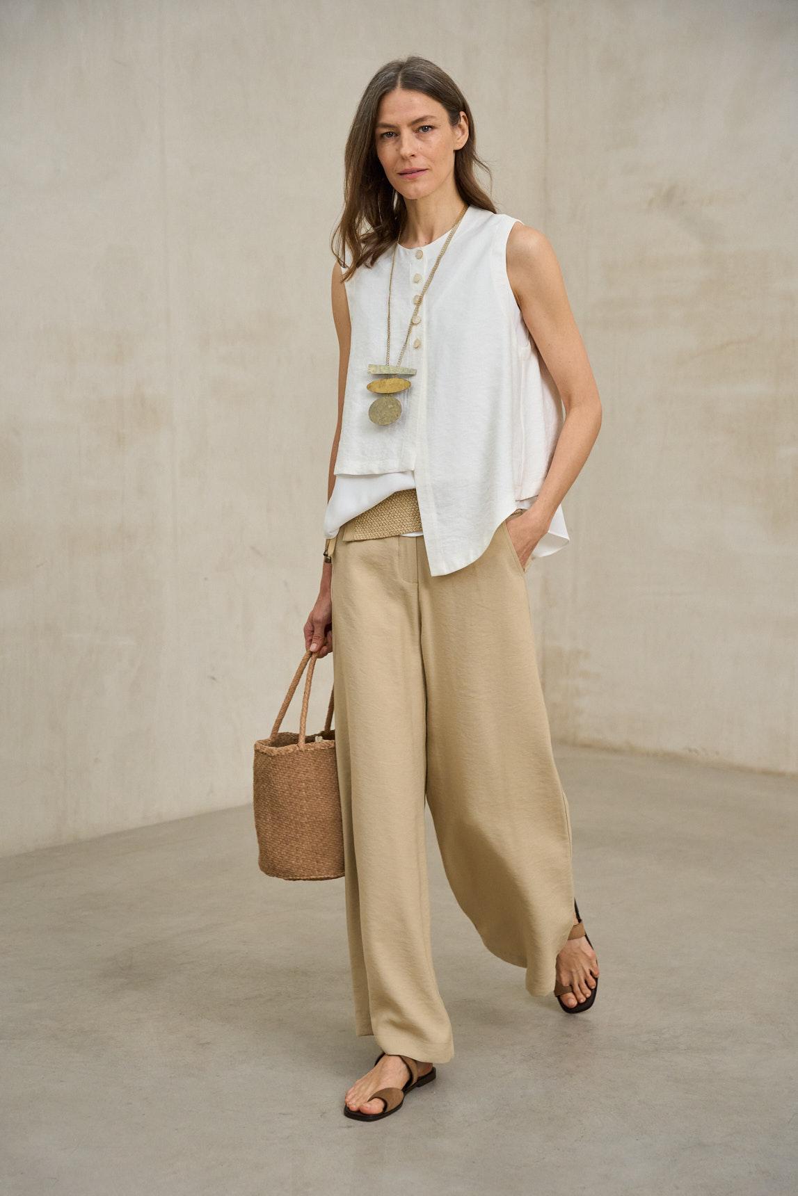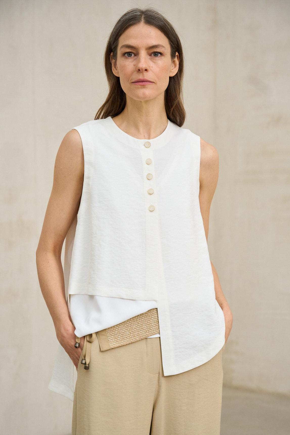 Chaleco de mujer confeccionado en tejido con textura arrugada de aspecto natural. Diseño sin mangas con cuello redondo, cierre frontal con botones al tono y bolsillos de plastrón que aportan funcionalidad al conjunto. La estructura amplia y el bajo asimétrico crean una silueta fluida y favorecedora.