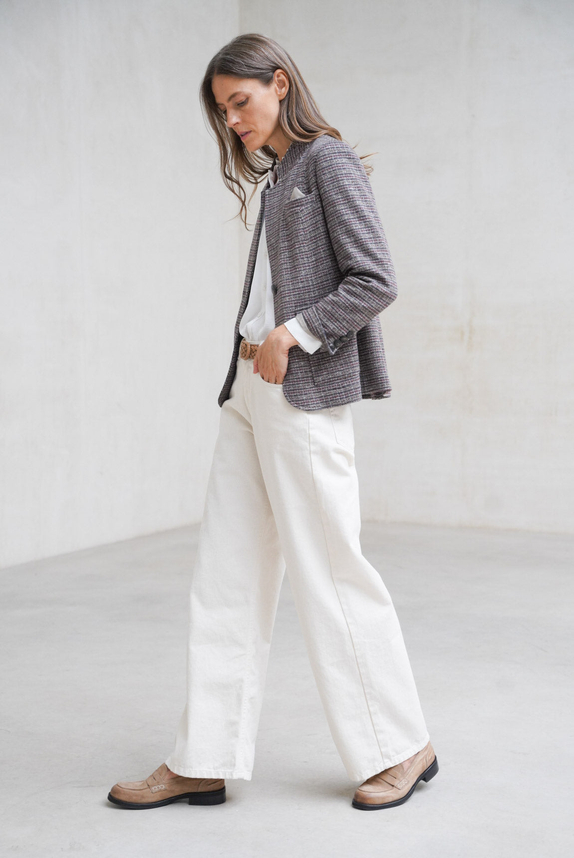 El pantalón Evoque crudo es una reinterpretación luminosa del clásico vaquero Rivera. Confeccionado con tejidos reciclados certificados y fibras sostenibles, mantiene el mismo diseño atemporal de cinco bolsillos, con una silueta recta y tiro medio. Su tono neutro y suave lo convierte en una pieza versátil, perfecta para looks frescos y equilibrados durante todo el año.