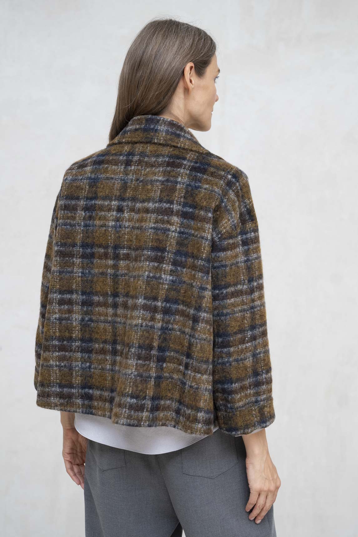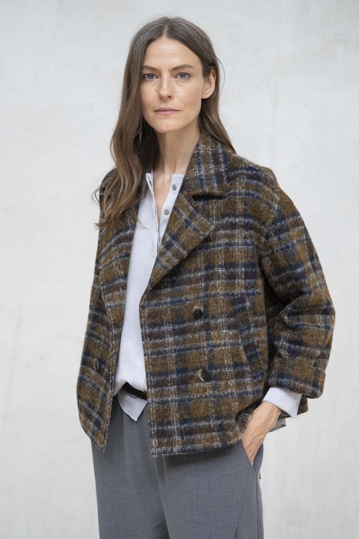 - Abrigo corto de lana con estampado de cuadros en tonos kaki, azul y marrón.