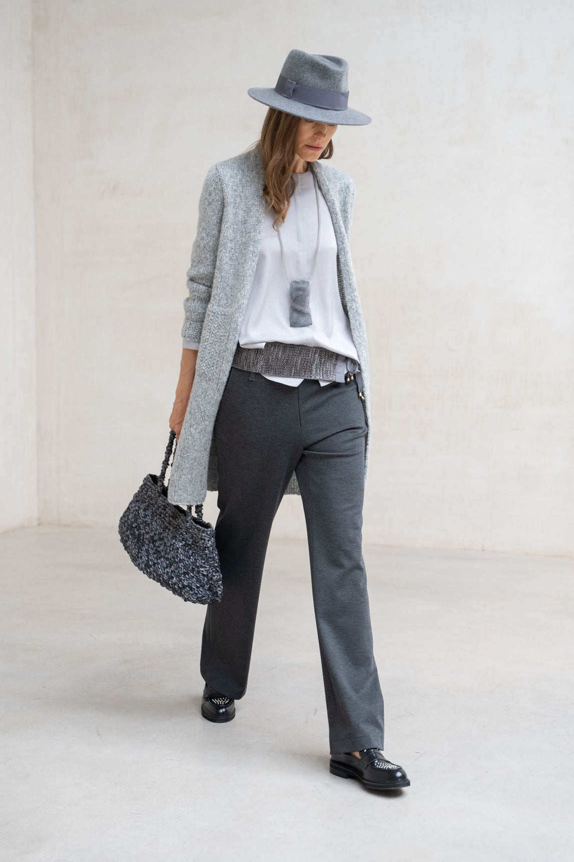 El cárdigan Merano gris perla lamé es perfecto para añadir un toque de brillo sutil a cualquier conjunto. Su tejido delicado y su diseño versátil lo convierten en una prenda imprescindible para el entretiempo y las jornadas frescas.