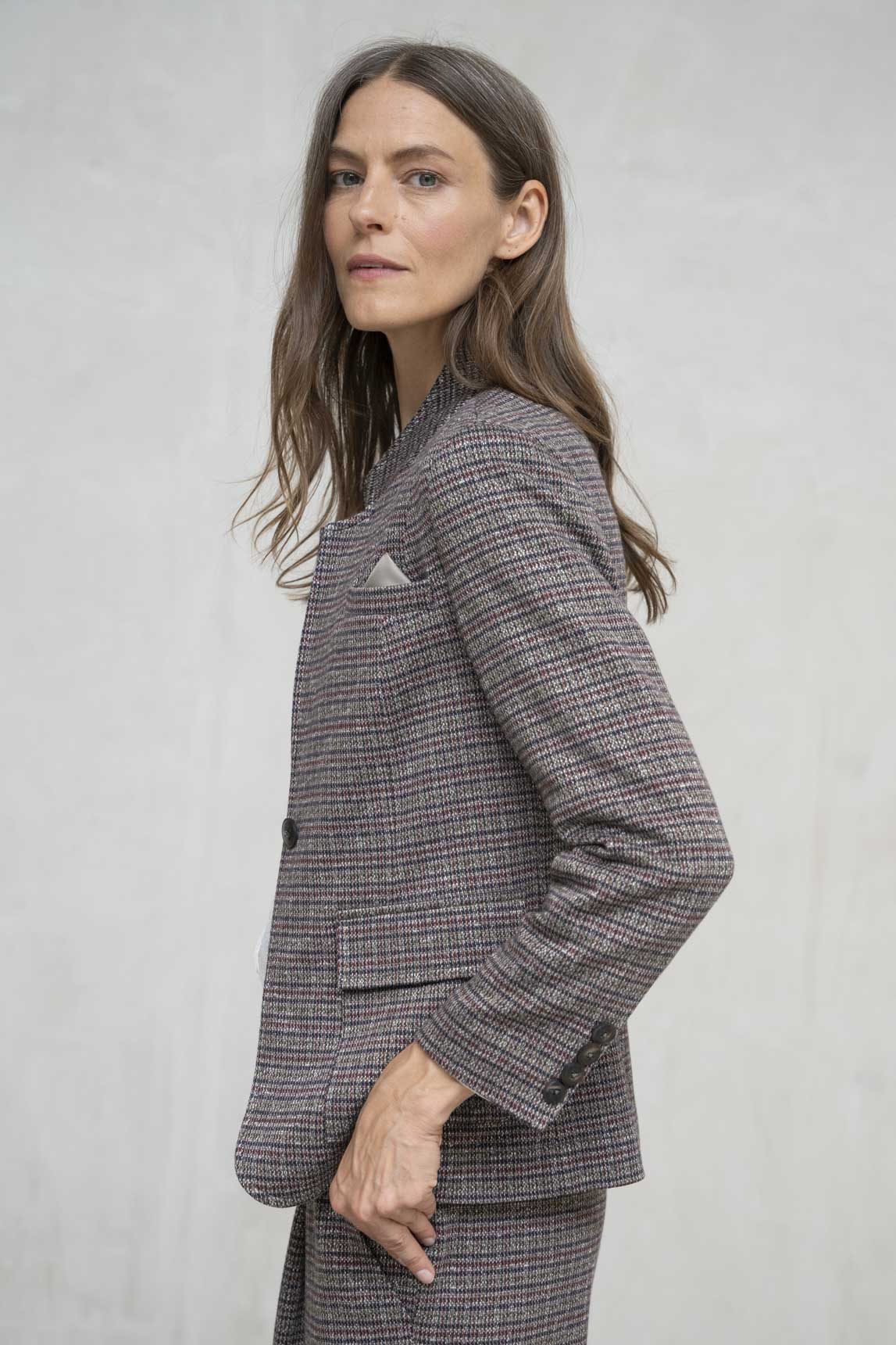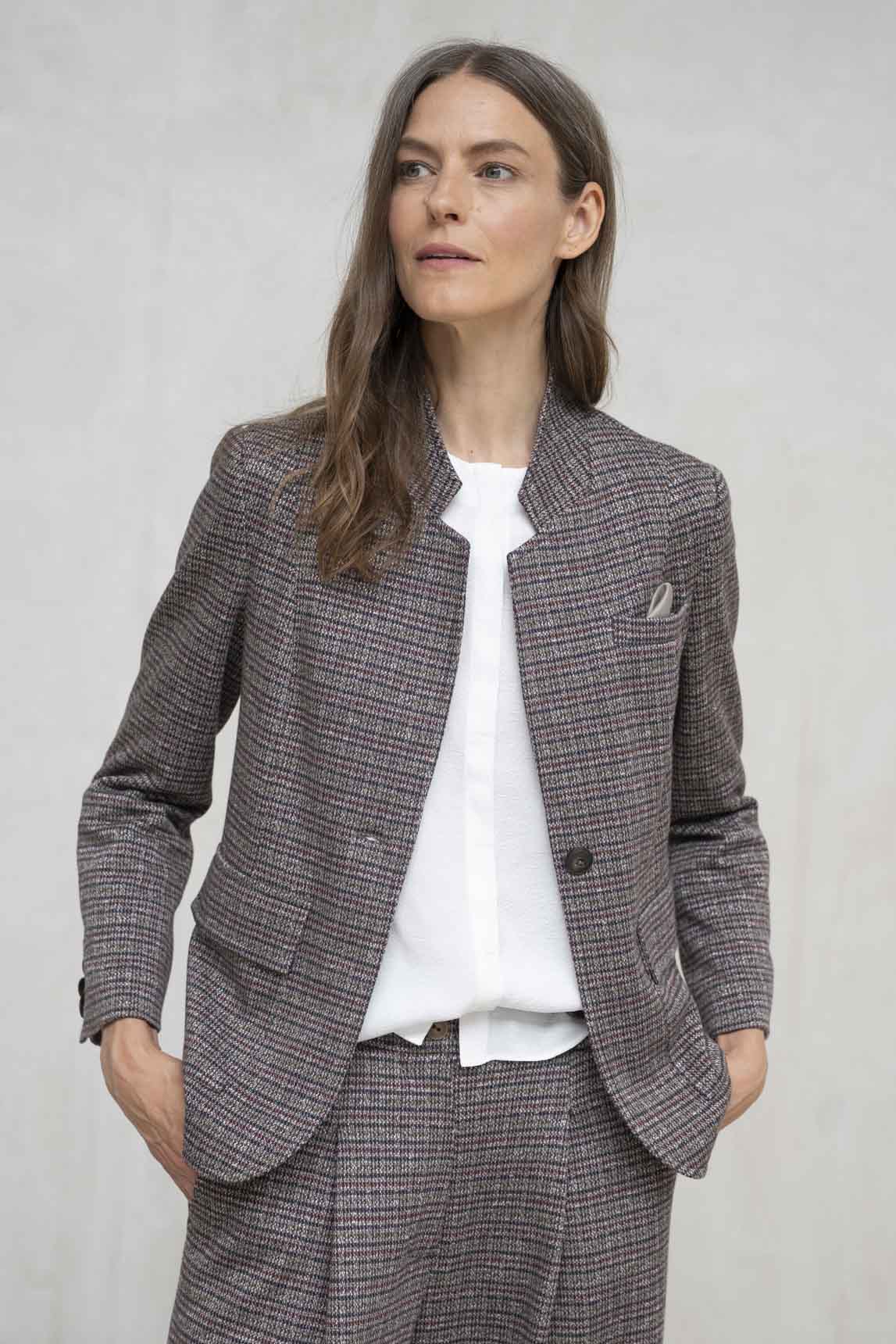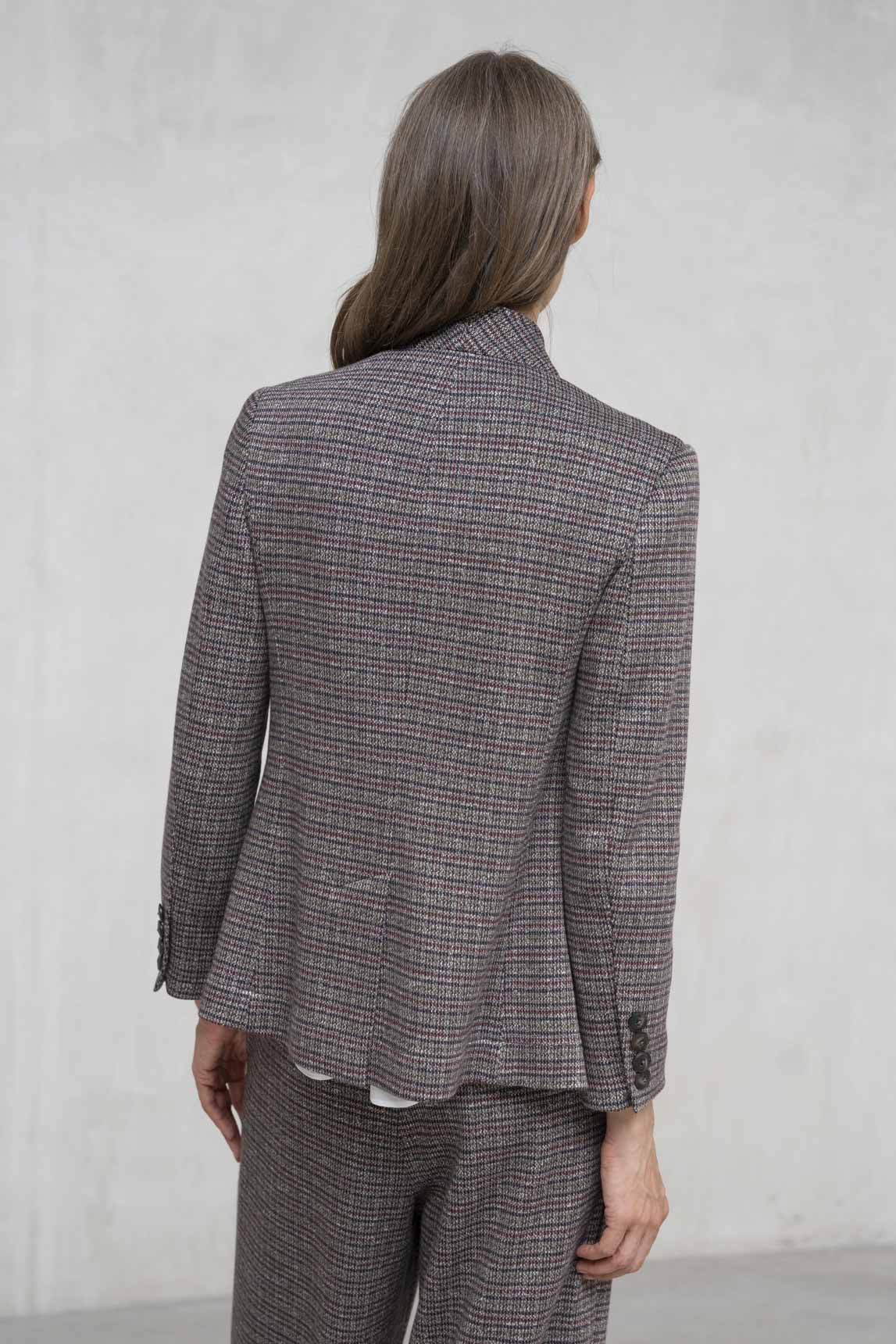 La chaqueta Ferrara cuadros gris y burdeos es una versión refinada y cálida del clásico estilo sastre. Su tejido con textura de espiga multicolor añade profundidad y elegancia, ideal para la temporada otoñal. Con su cuello mao y cierre sencillo, mantiene una línea sobria pero con carácter. Puedes llevarla con el pantalón a juego para un conjunto coordinado, o combinarla con prendas lisas para un look más casual y equilibrado.
