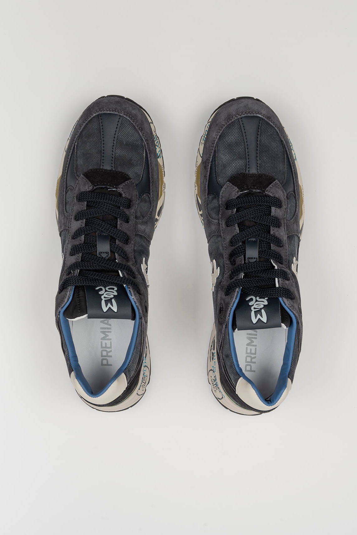 - Empeine mixto en ante gris oscuro y malla azul marino.