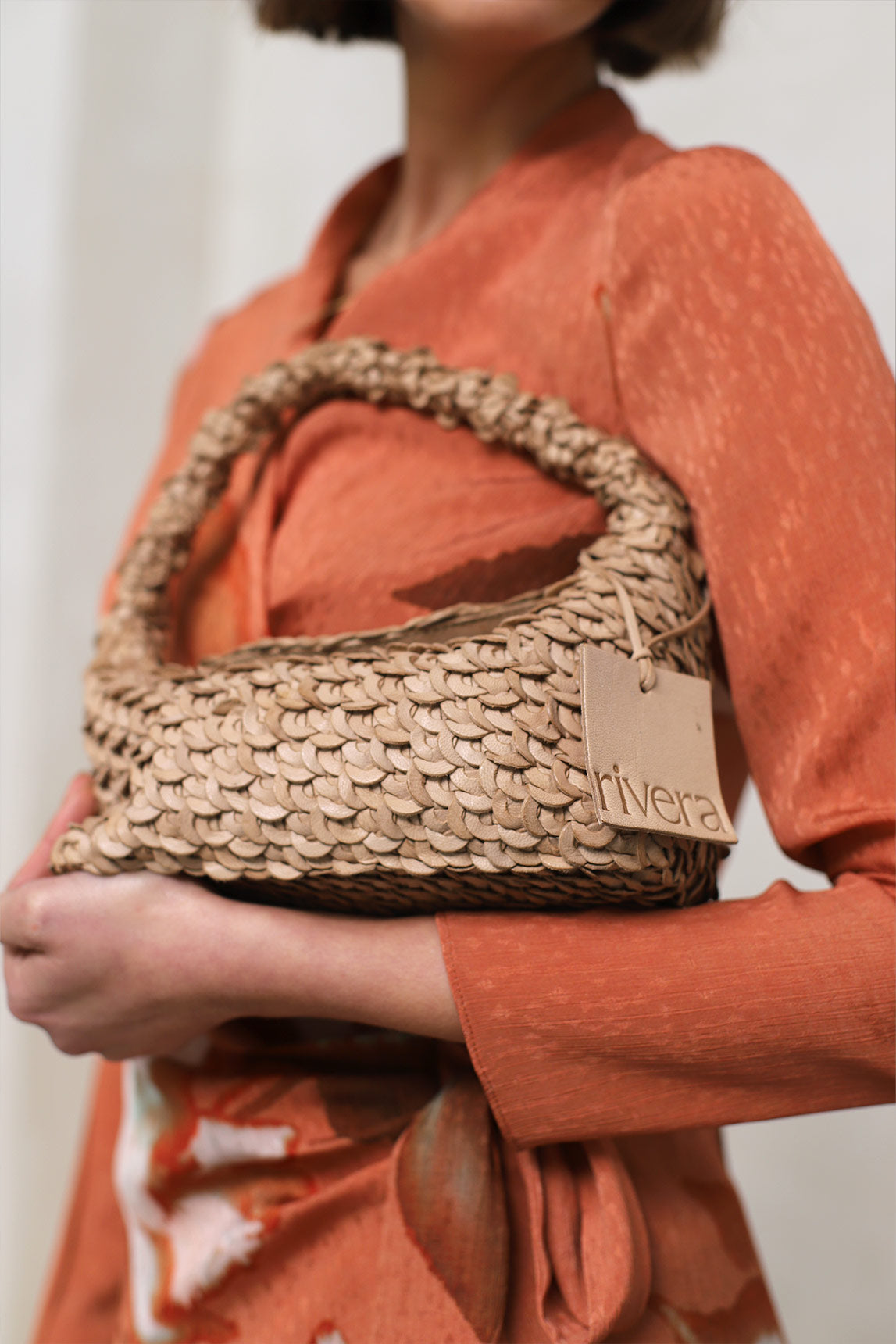Braided leather bag in light beige tone, elegant and luminous, ideal for soft styles and natural combinations.