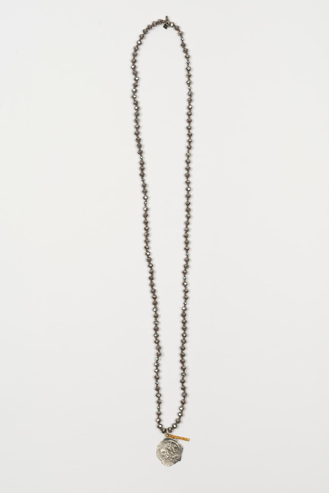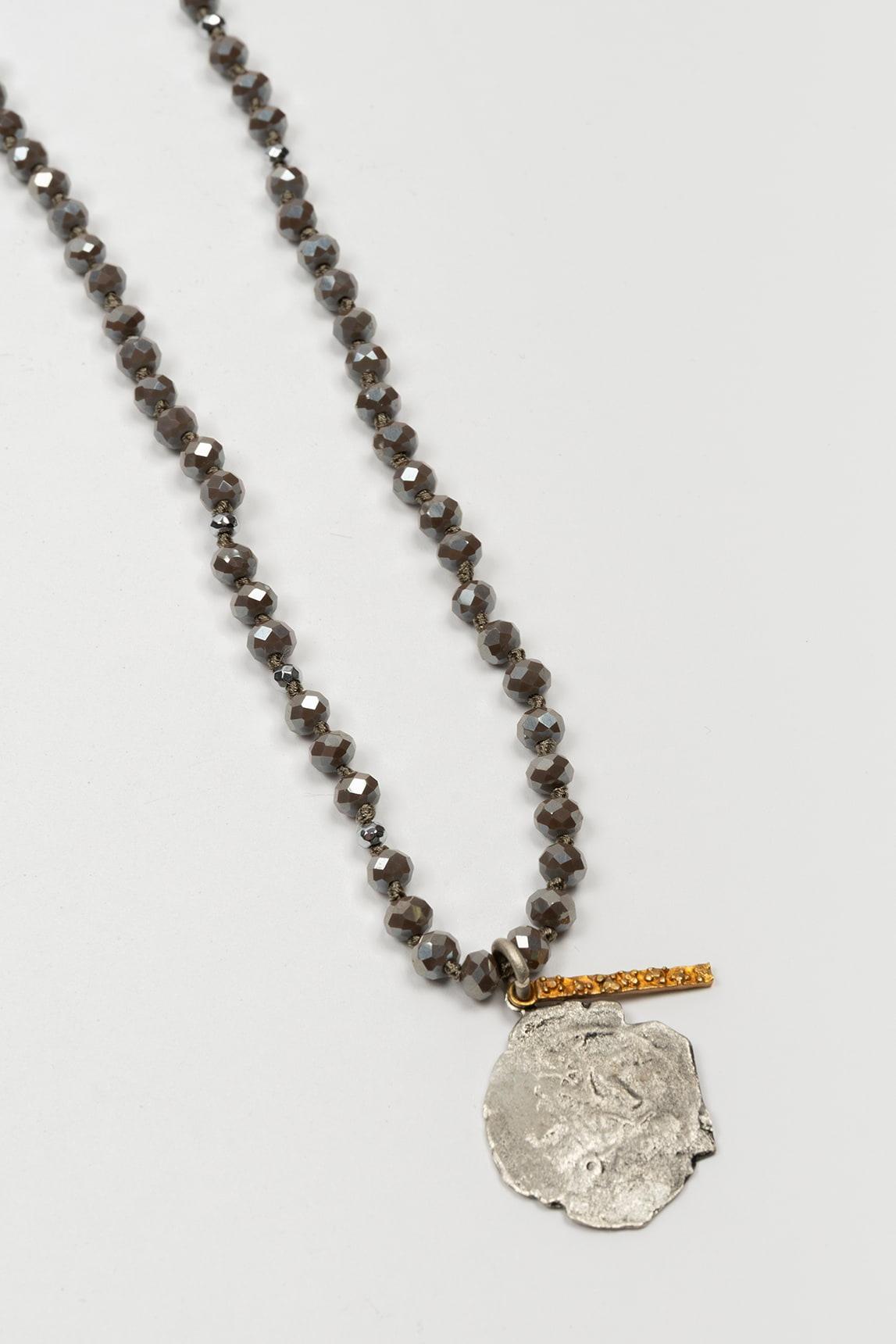 Collar de mujer con cuentas en tono gris oscuro de acabado facetado y pequeñas piezas metálicas intercaladas. El diseño incorpora un colgante de forma orgánica en metal texturizado junto a una barra decorativa que refuerza su estética artesanal. El conjunto aporta profundidad y un carácter más sobrio y contemporáneo.