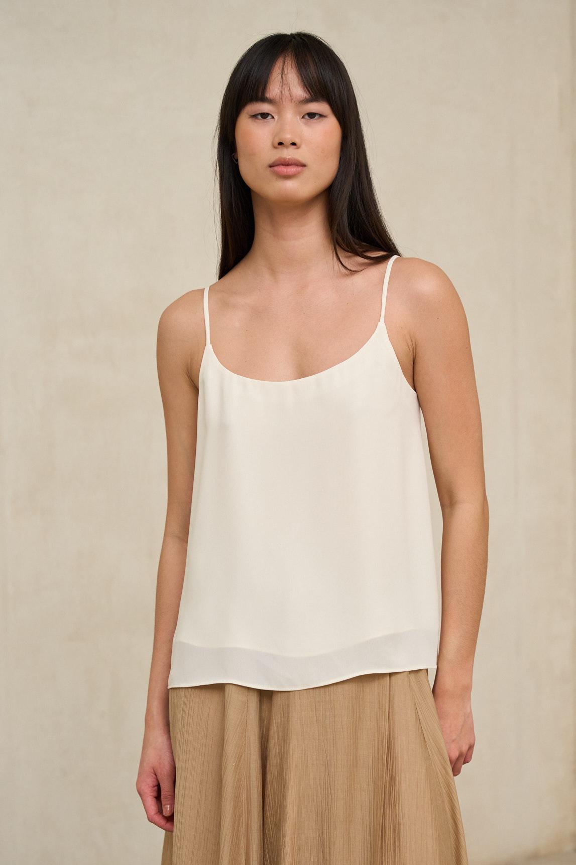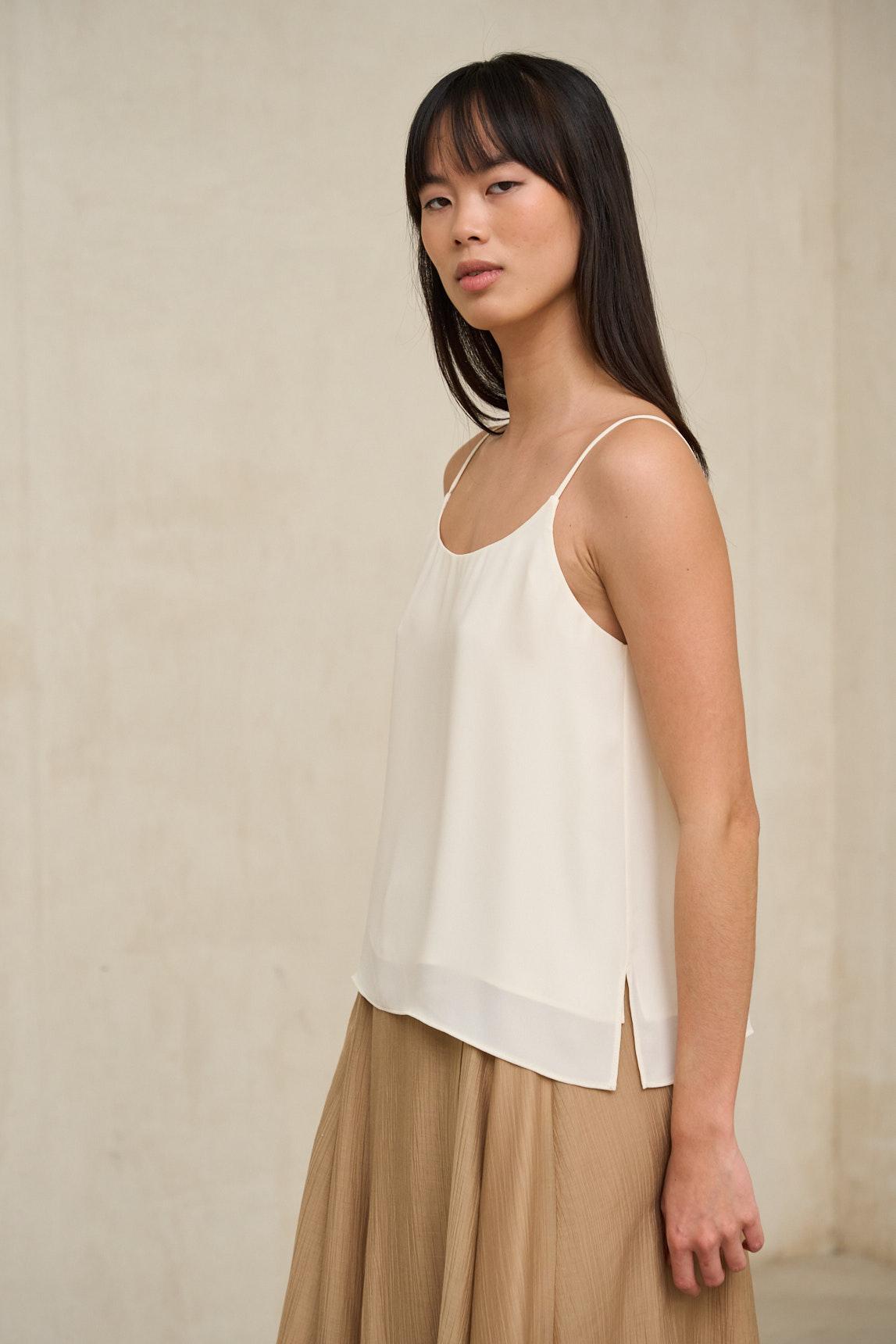 El top Alenia crudoes una prenda básica imprescindible dentro del armario neutro, pensada para aportar suavidad, versatilidad y equilibrio a cualquier estilismo. Confeccionado en tejido ligero y agradable al tacto, se adapta con naturalidad a la silueta sin marcar, creando una línea limpia y favorecedora. Presenta escote redondo y diseño sin mangas, lo que lo convierte en una opción ideal para los meses cálidos o como prenda base en looks por capas. El tono crudo aporta calidez y sofisticación, integrándose fácilmente con blancos rotos, marrones, verdes suaves o azul marino. Funciona perfectamente como top protagonista combinado con pantalones fluidos o faldas midi, pero también como base discreta bajo prendas de punto ligero o tejidos de efecto sutilmente translúcido, como el jersey Lúvena. Una pieza sencilla, cómoda y atemporal que resuelve múltiples combinaciones con elegancia natural. Nos esforzamos por mostrar los colores de la forma más fiel posible, pero pueden variar ligeramente respecto a la realidad.