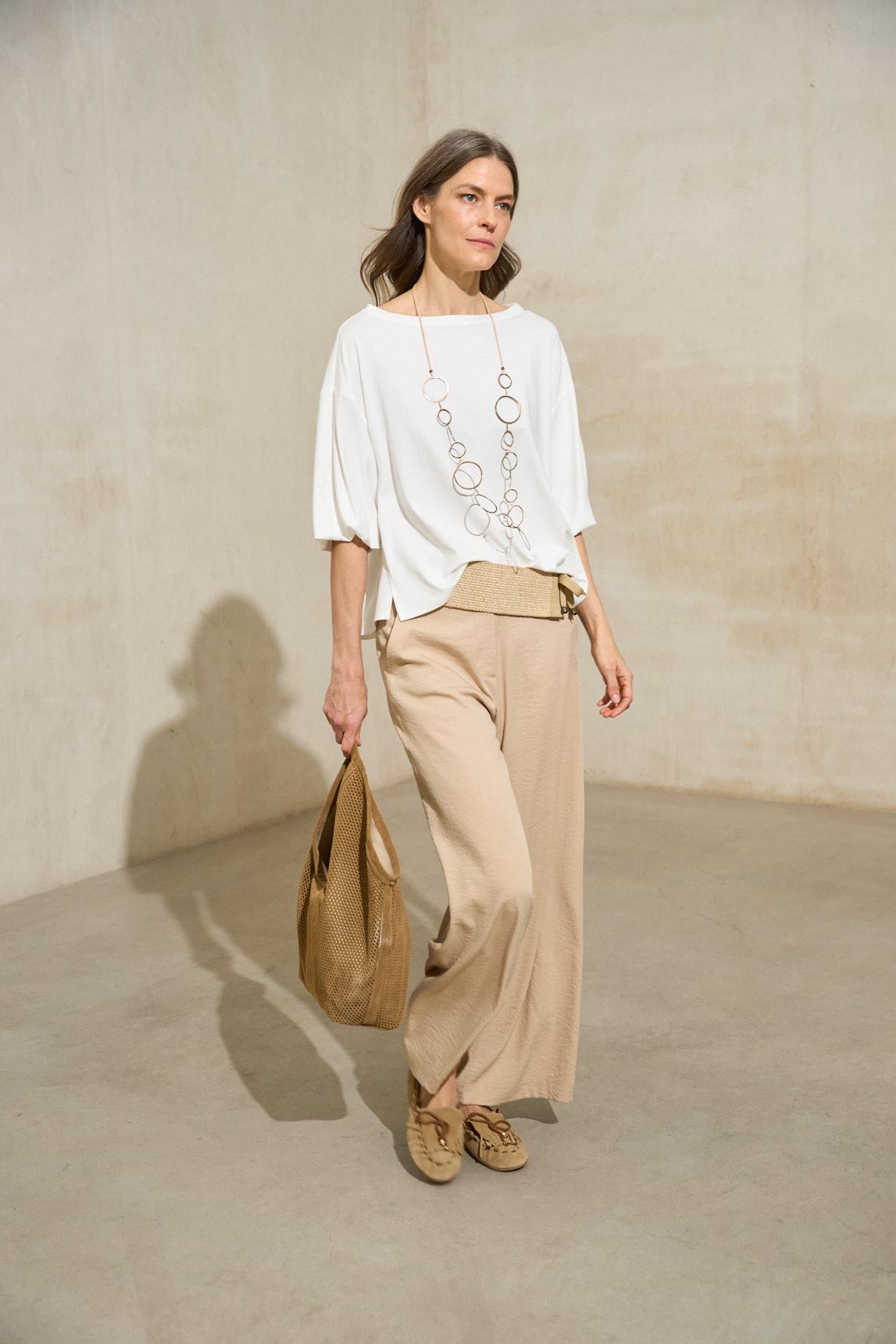 The Eira white T-shirt stands out for its understated elegance and versatility. Its neutral tone complements the entire season's color palette and is ideal for everyday looks or more sophisticated outfits. An elevated wardrobe staple that's comfortable and timeless.