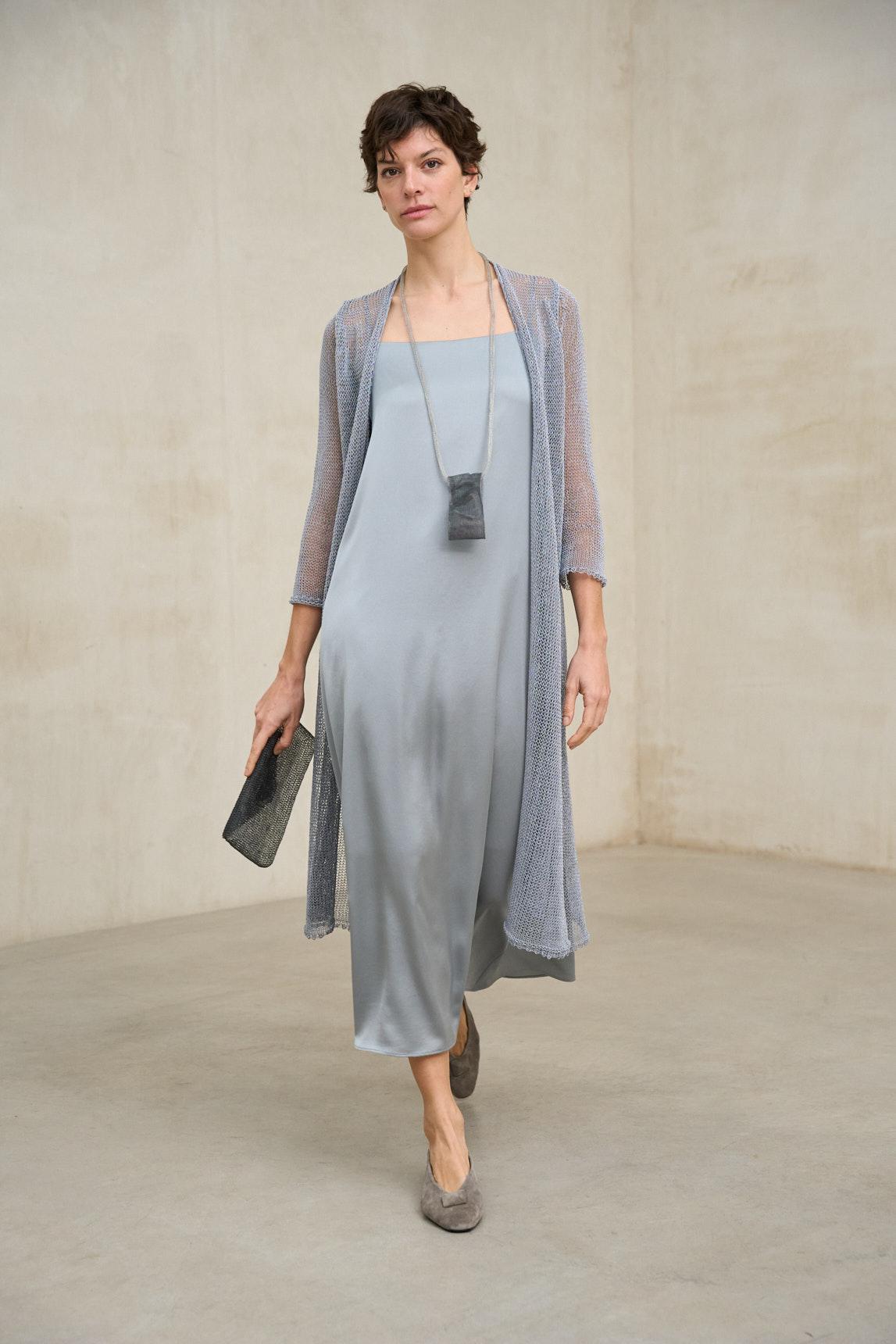 El vestido Soreya azul humo es una pieza de líneas depuradas y estética minimalista, confeccionada en tejido ligero con caída fluida. Su diseño de tirantes finos y escote recto suavemente curvado realza hombros y clavícula con una elegancia sutil y contemporánea. La silueta evasé aporta movimiento natural y ligereza, creando un efecto estilizado sin ceñir la figura.