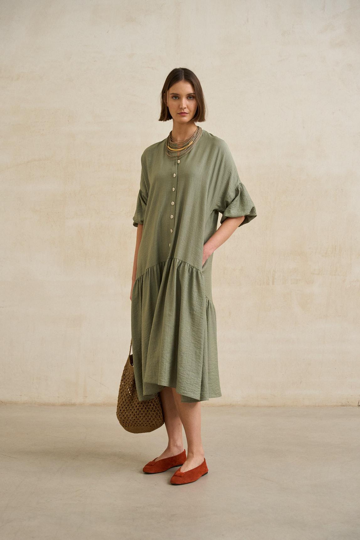 The Arisse Sage Green Dress combines soft structure and relaxed elegance in a feminine, flowing silhouette. Crafted from a lightweight, natural-feel fabric, it features a shirt collar, full button front, and subtly structured short sleeves.