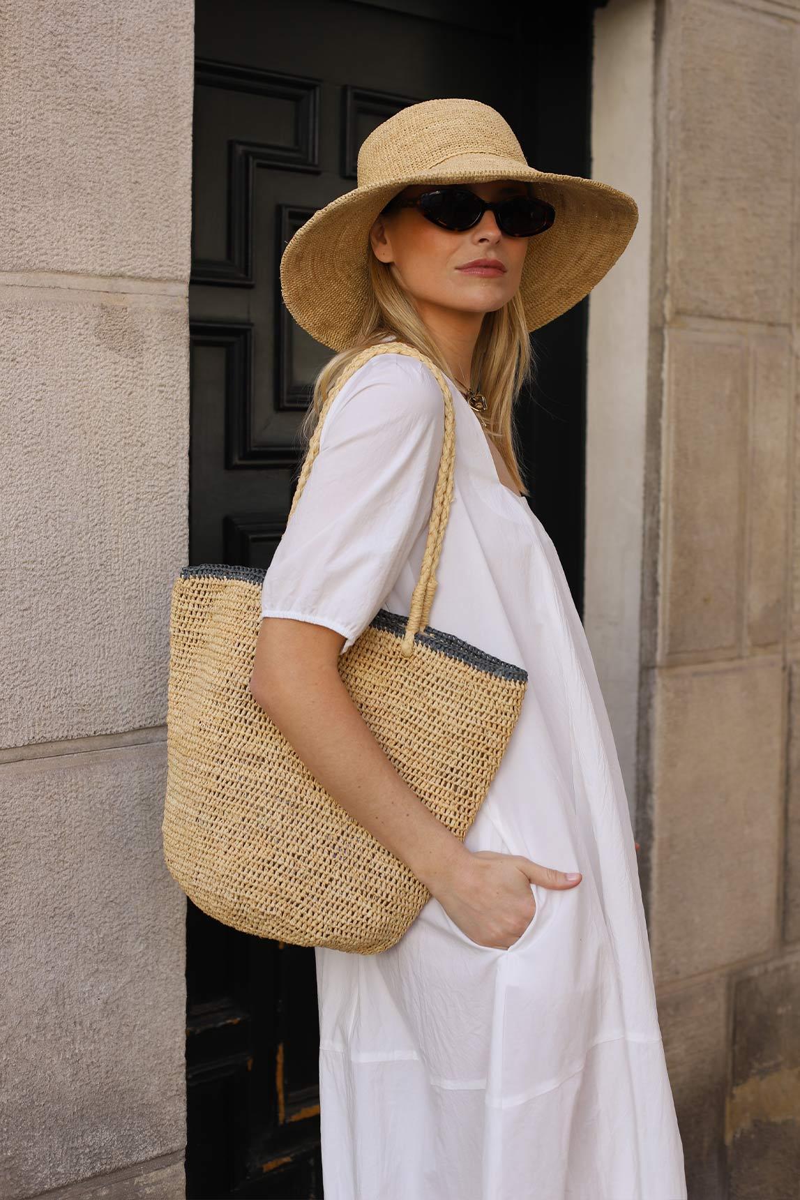 Measuring 56 × 38 × 18 cm with a 24 × 15 cm handle, it offers enough space to accompany daily routines or weekend plans: wallet, sunglasses, toiletry bag, and other essentials. It's an ideal option as a natural raffia bag, a summer shopper bag, or a neutral accessory for relaxed outfits.