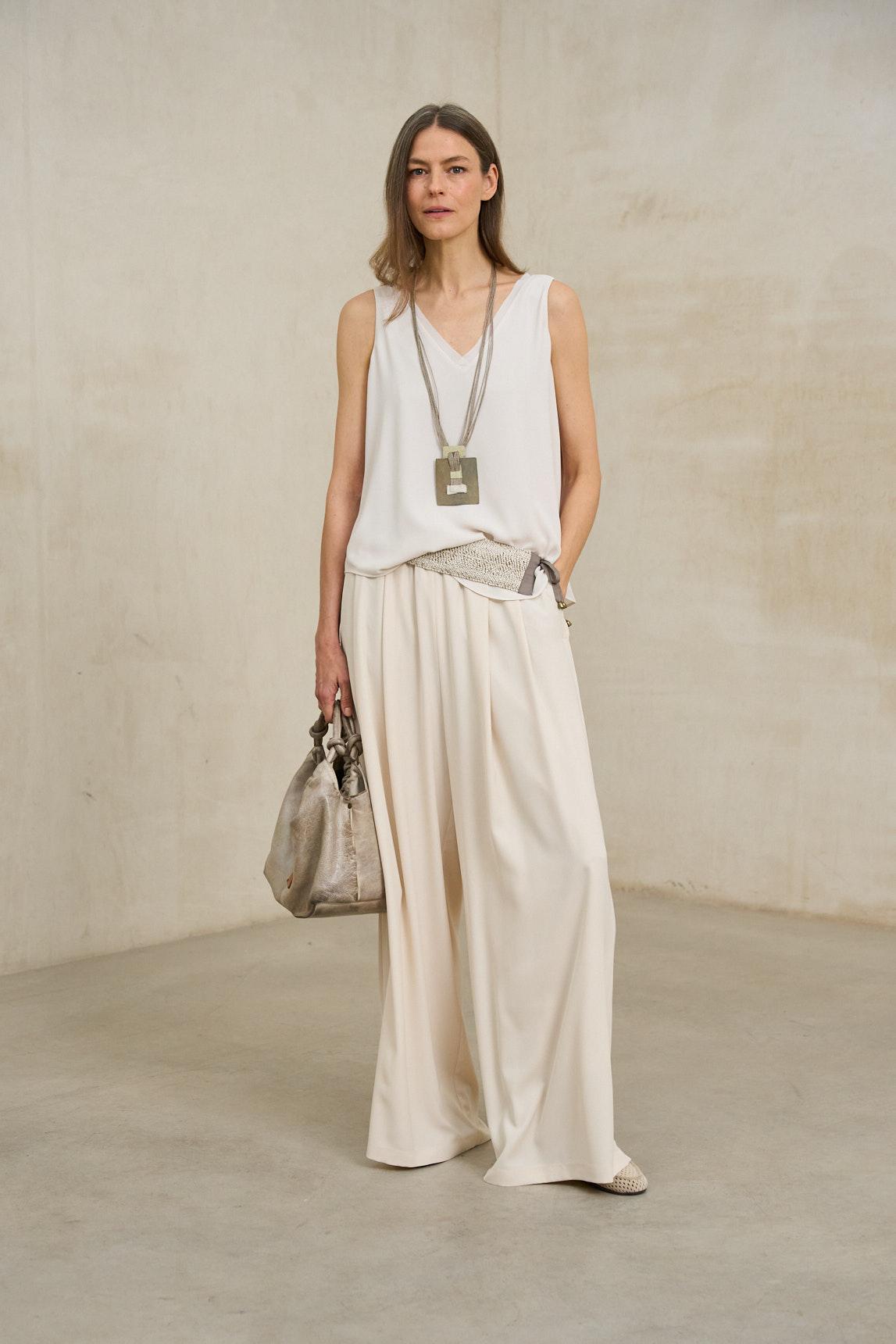 Su tono crudo, cálido y atemporal, lo convierte en una pieza versátil dentro del armario neutro, ideal para combinar con blusas fluidas, tops estructurados o chaquetas ligeras en la misma gama cromática. El Lirien crudo es perfecto para looks relajados de verano, estilismos de oficina con un enfoque minimalista o conjuntos más cuidados para ocasiones especiales. Su amplitud aporta comodidad sin renunciar a una estética refinada y contemporánea.