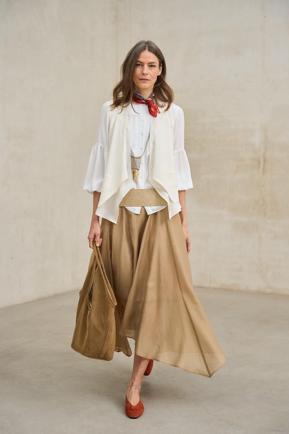 La Blusa Liora blanco es una prenda ligera y fluida diseñada para aportar suavidad y elegancia natural al look. Confeccionada en tejido vaporoso de caída delicada, presenta escote en pico y manga larga amplia con acabado elástico en el puño, que genera un efecto ligeramente ablusado. Su silueta relajada y el movimiento del tejido aportan feminidad sin exceso, convirtiéndola en una blusa versátil tanto para estilismos formales como para combinaciones más casuales.