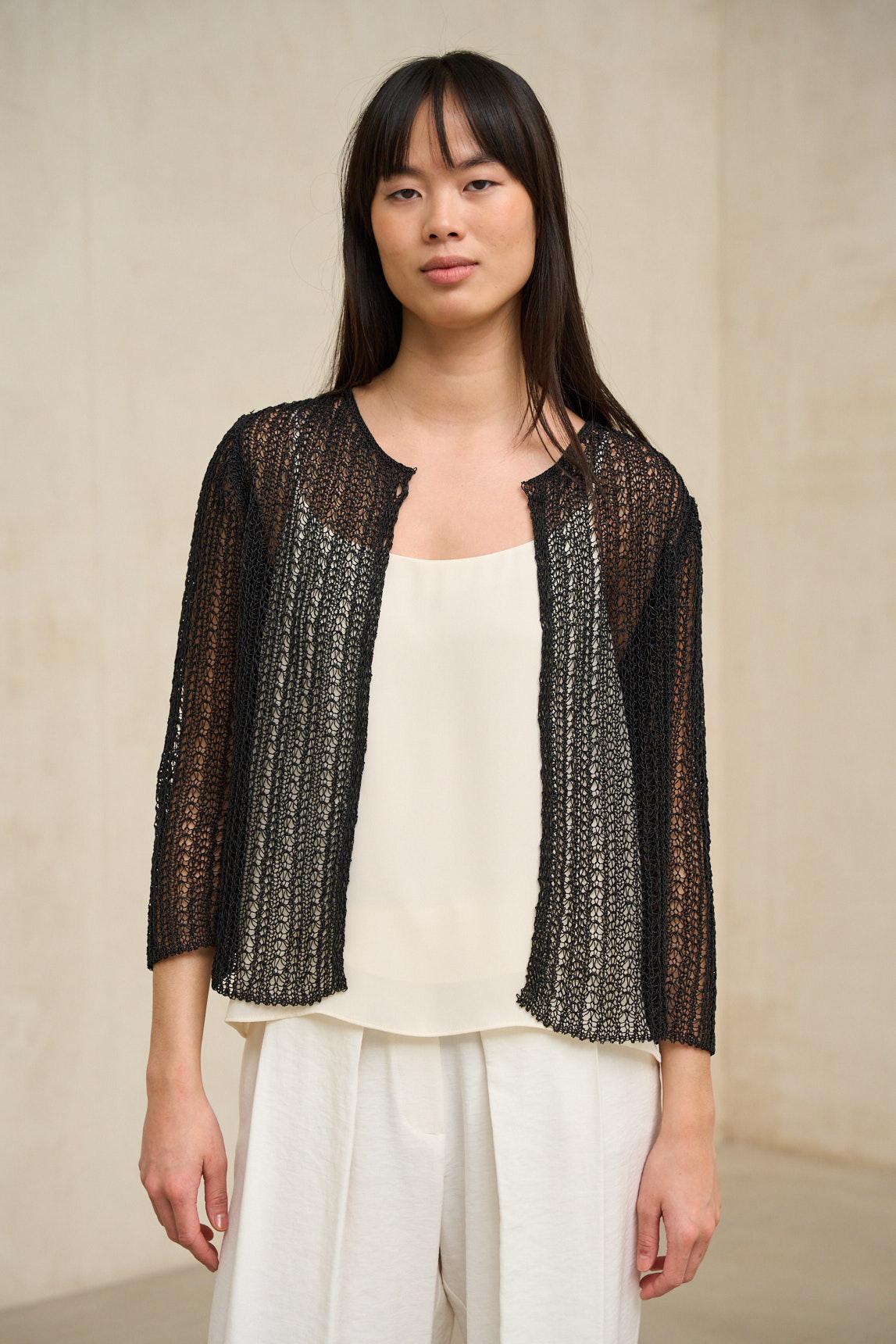 Chaqueta de mujer confeccionada en punto ligero con textura calada y caída fluida. Su diseño abierto, sin cierres, potencia la sensación de ligereza y movimiento, mientras que la manga tres cuartos equilibra la silueta con un aire contemporáneo y sofisticado. El tejido presenta una transparencia sutil y elegante que aporta profundidad visual y un efecto de capas muy cuidado.