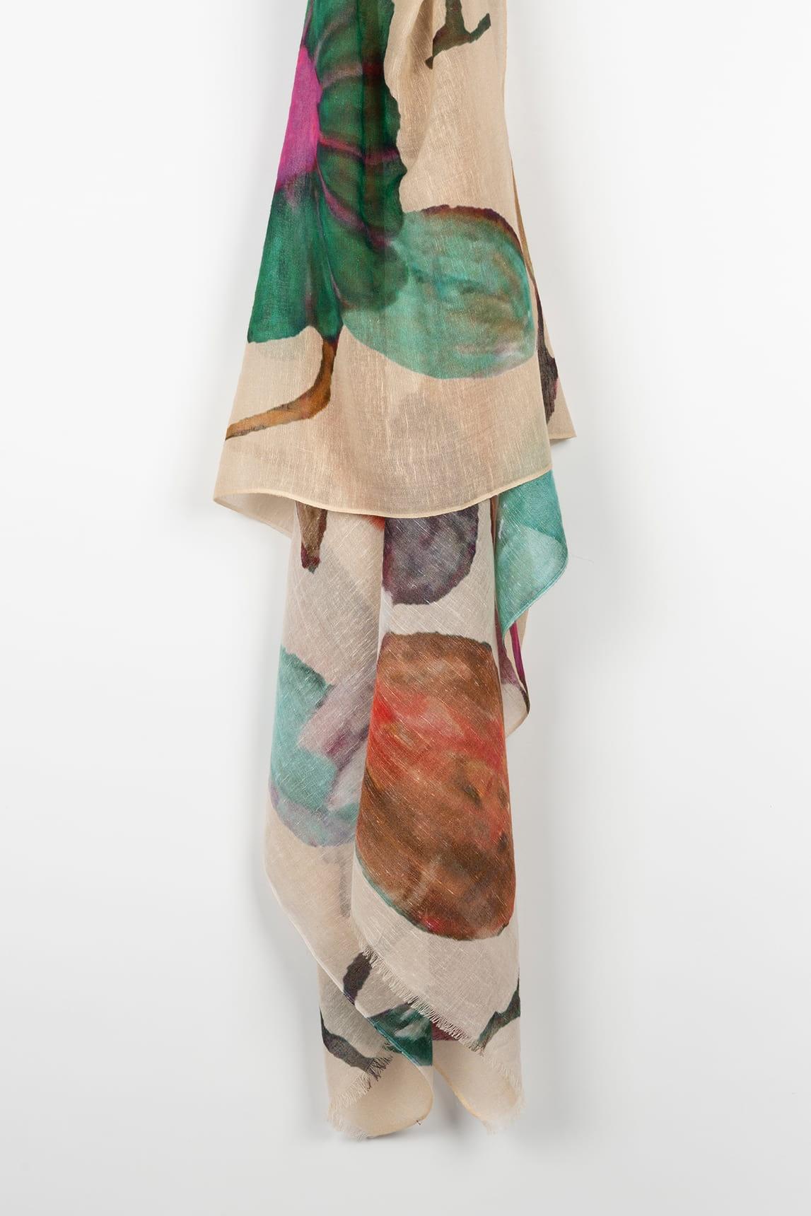 El fular Arhena Natural presenta un estampado artístico de gran formato con pinceladas orgánicas en tonos verde esmeralda, coral tostado y matices tierra sobre una base beige cálida. El contraste entre las formas fluidas y el fondo neutro crea un equilibrio sofisticado y contemporáneo.