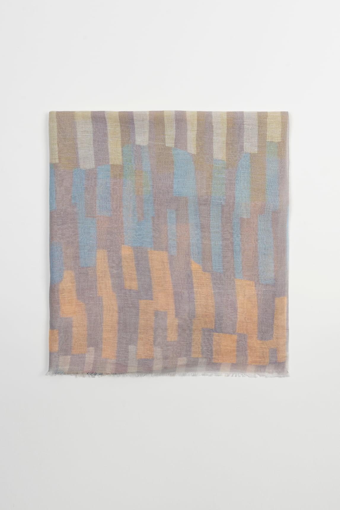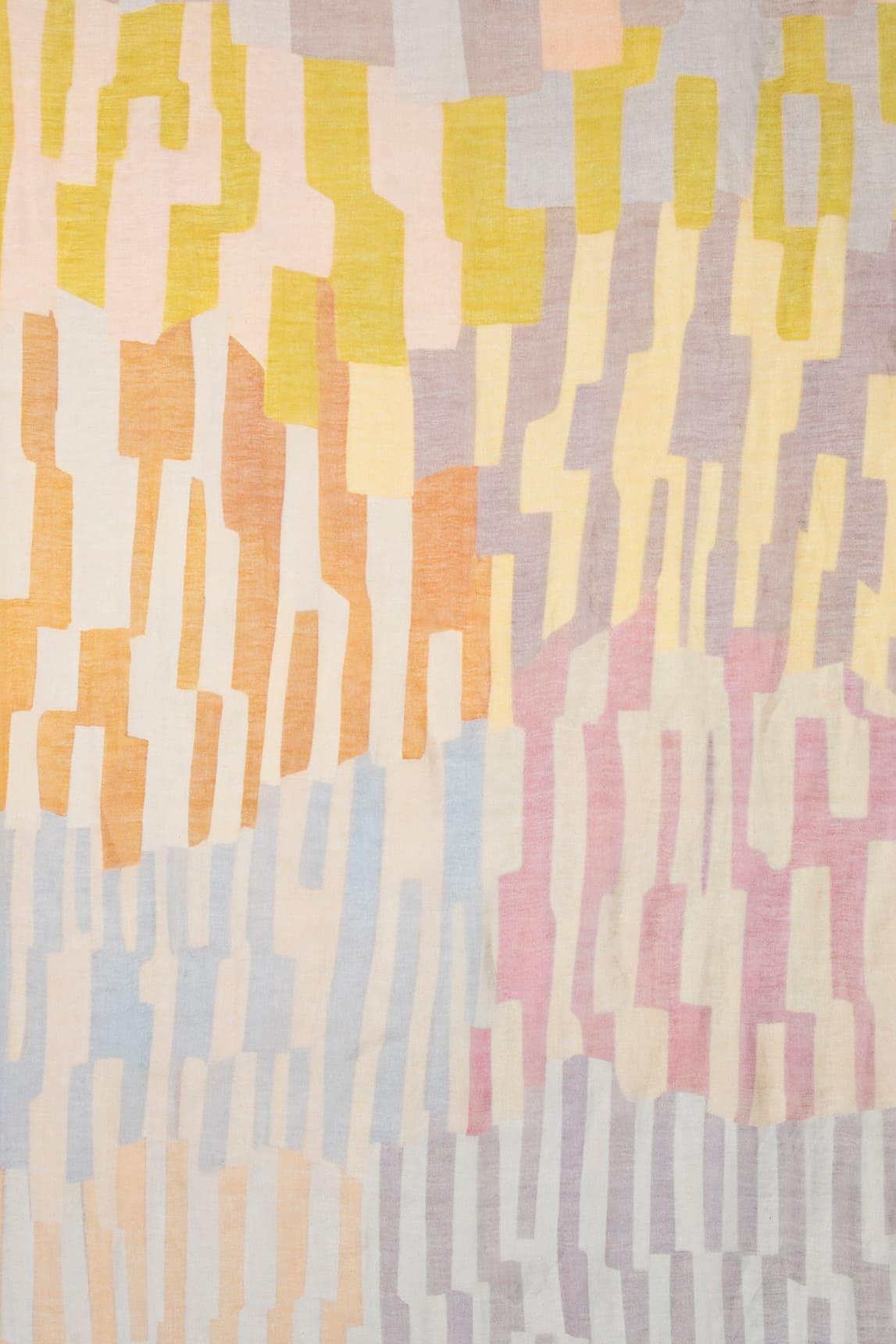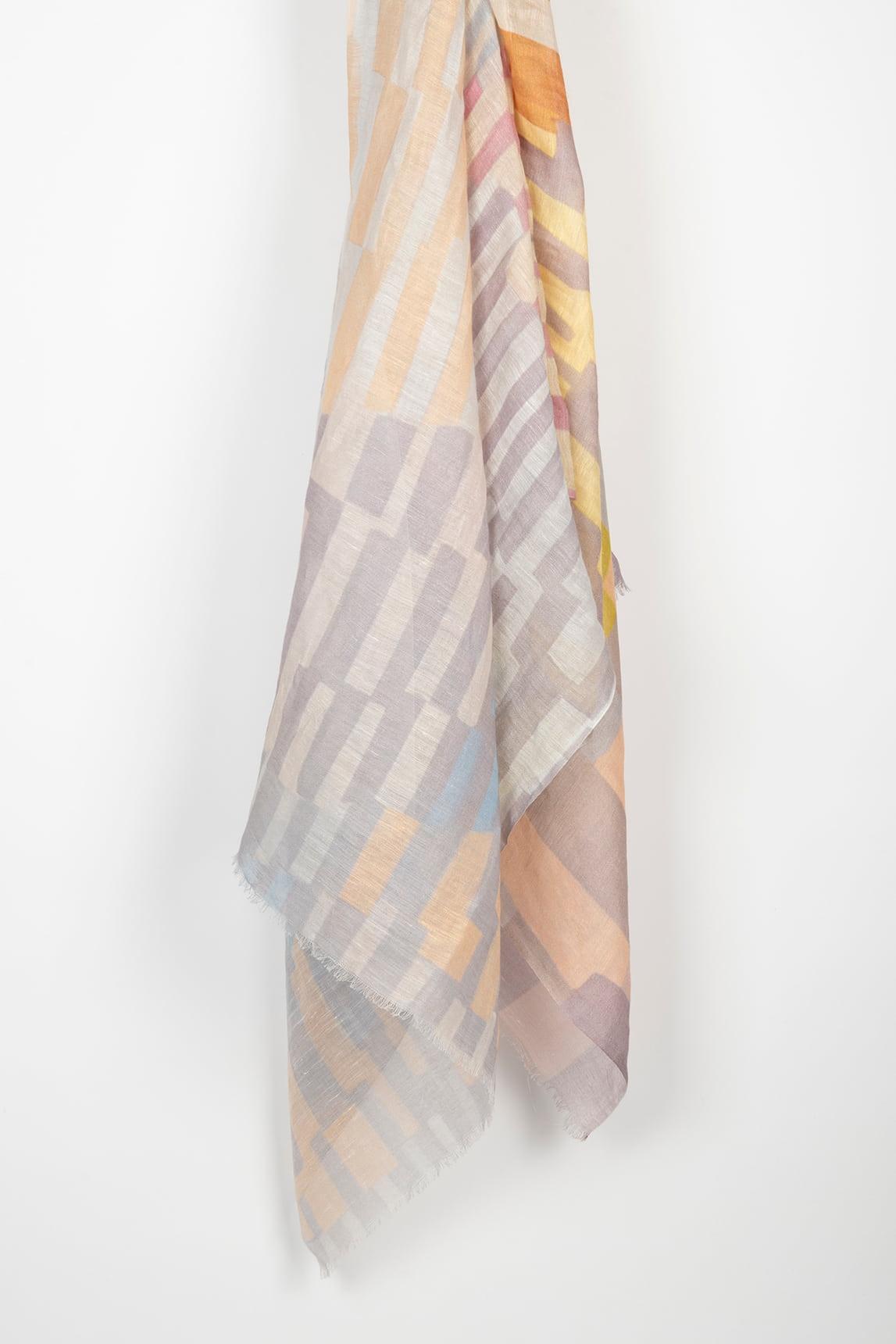 Women's scarf made from a natural blend of 70% linen and 30% cotton. Its light and airy fabric features a geometric print in pastel shades—lavender, sand, yellow, and soft blue—that adds brightness and visual balance. The frayed edges enhance its handcrafted and relaxed finish. The Eida Pastel Scarf combines texture, softness, and color in a versatile and timeless piece. Ideal for pairing with neutral or summer-inspired looks, it adds an artistic and natural touch to daytime or travel outfits. We strive to display colors as accurately as possible, but they may vary slightly from reality.
