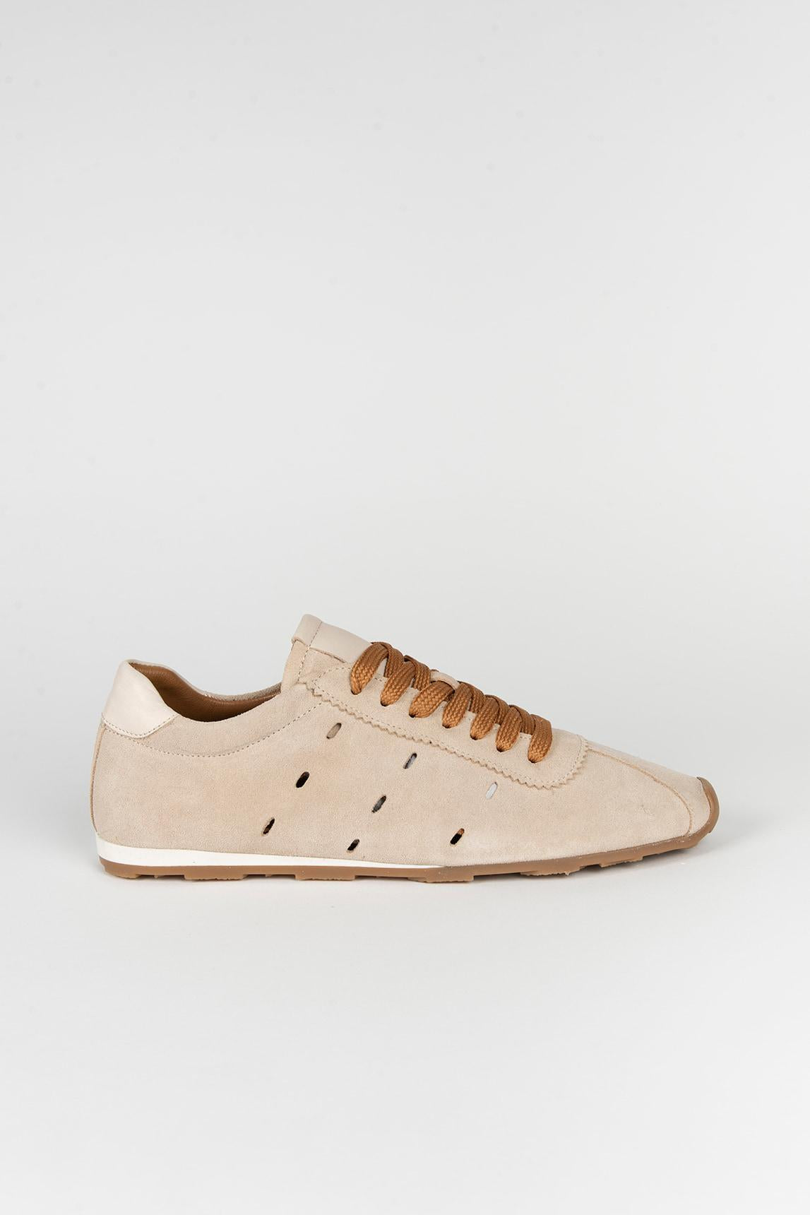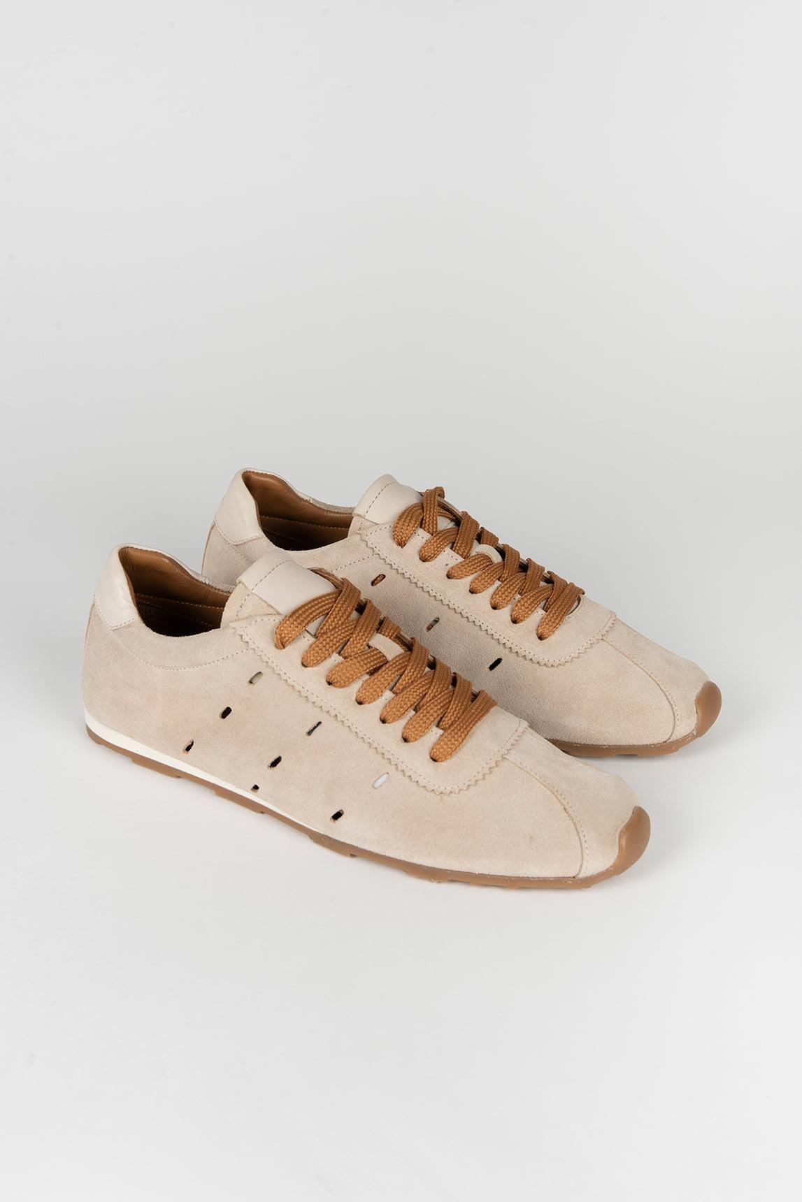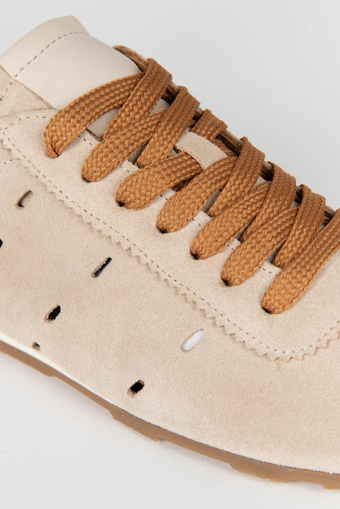 Confeccionada en piel serraje suave, presenta detalles perforados laterales que favorecen la transpirabilidad y aportan textura al diseño. Los cordones en tono camel generan un contraste cálido con la base arena, mientras que la suela flexible proporciona comodidad y estabilidad en cada paso.