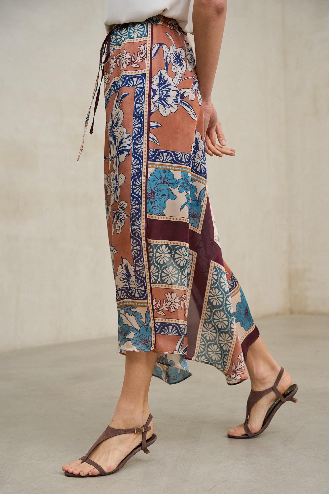 Falda midi confeccionada en tejido ligero con movimiento fluido y caída natural. Presenta diseño asimétrico con picos irregulares que aportan dinamismo y un aire desenfadado al conjunto. El estampado combina tonos terracota, azul verdoso y matices neutros en un patrón artístico de inspiración artesanal que aporta carácter sin resultar recargado. La Falda Sinaia destaca por su silueta envolvente y su estructura ligera, que acompaña el movimiento al caminar y estiliza la figura. El juego de color permite combinarla fácilmente con tops lisos en crudo, azul petróleo o tonos tierra, equilibrando el protagonismo del estampado con prendas más depuradas. Ideal para primavera y verano, funciona tanto con sandalias planas para un look relajado como con cuñas o tacón medio para una propuesta más sofisticada. Una pieza versátil que aporta personalidad y fluidez al armario estacional. Nos esforzamos por mostrar los colores de la forma más fiel posible, pero pueden variar ligeramente respecto a la realidad.