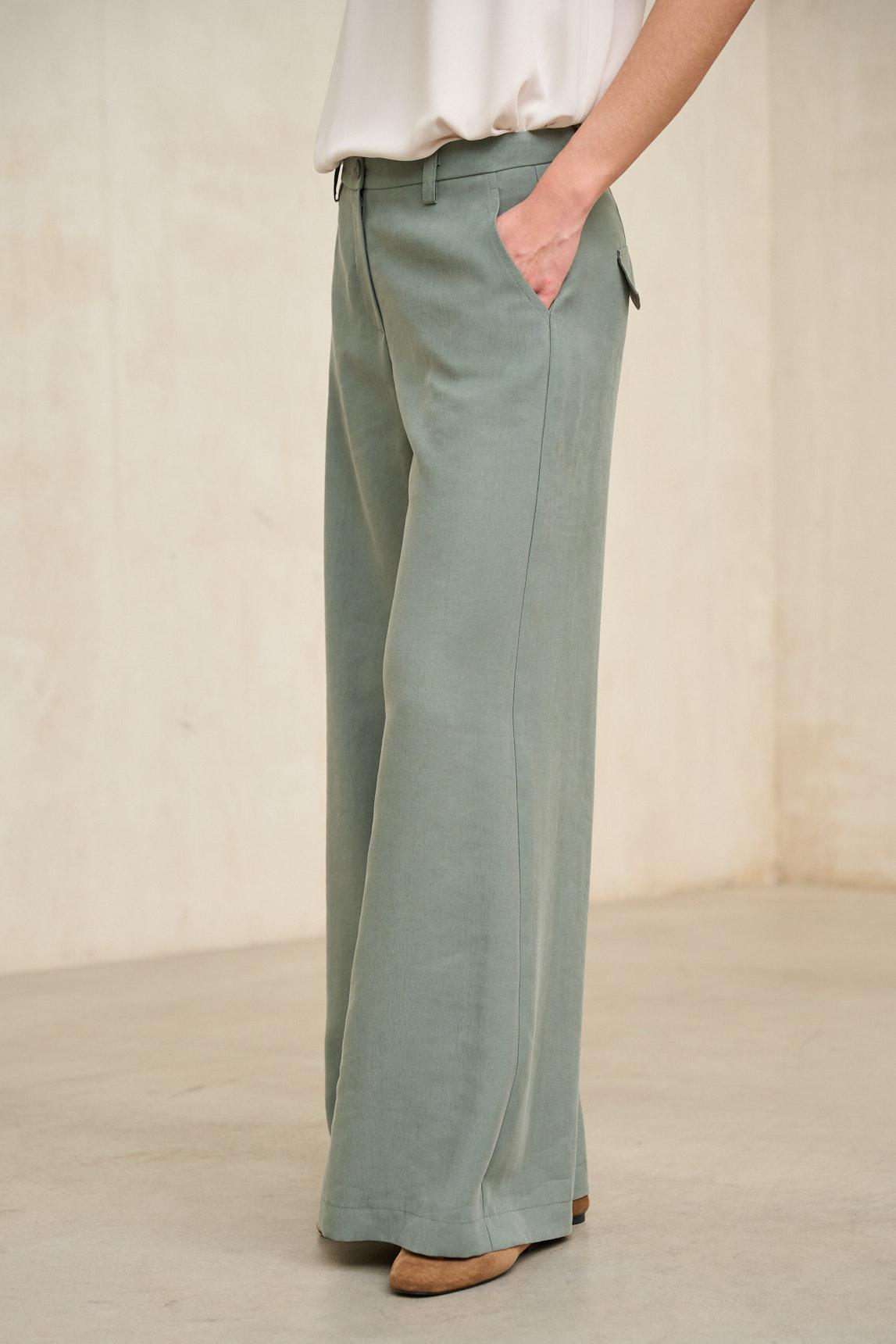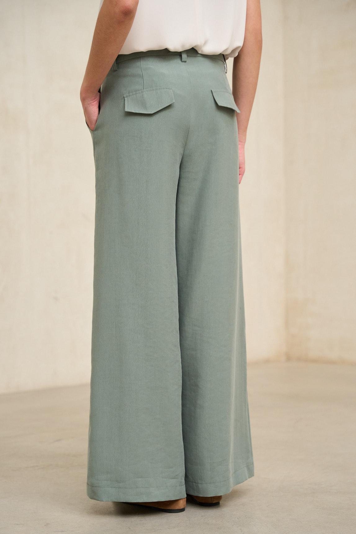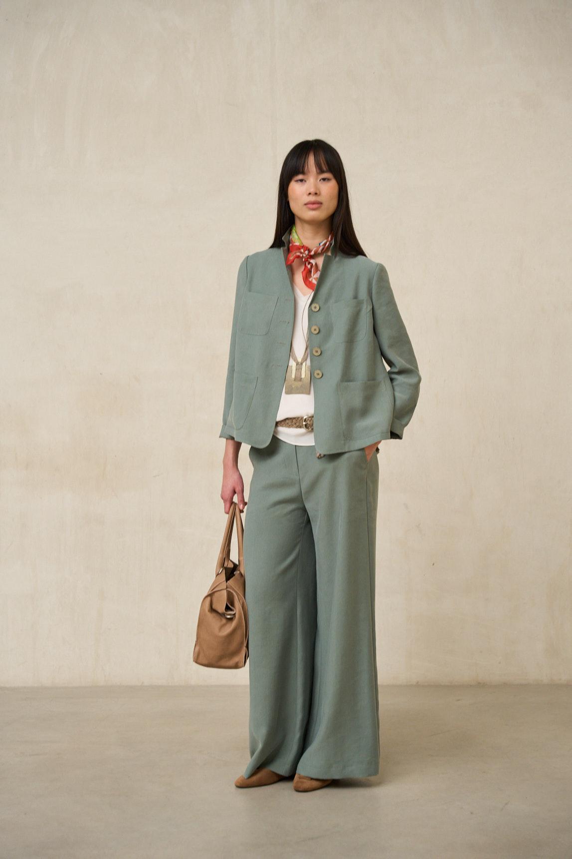 El pantalón Lysel verde salvia mantiene su característica silueta amplia y recta, con una caída fluida que acompaña el movimiento con naturalidad. La cintura estructurada y el cierre limpio aportan un acabado depurado que equilibra el volumen de la pernera ancha, creando una línea estilizada y contemporánea.