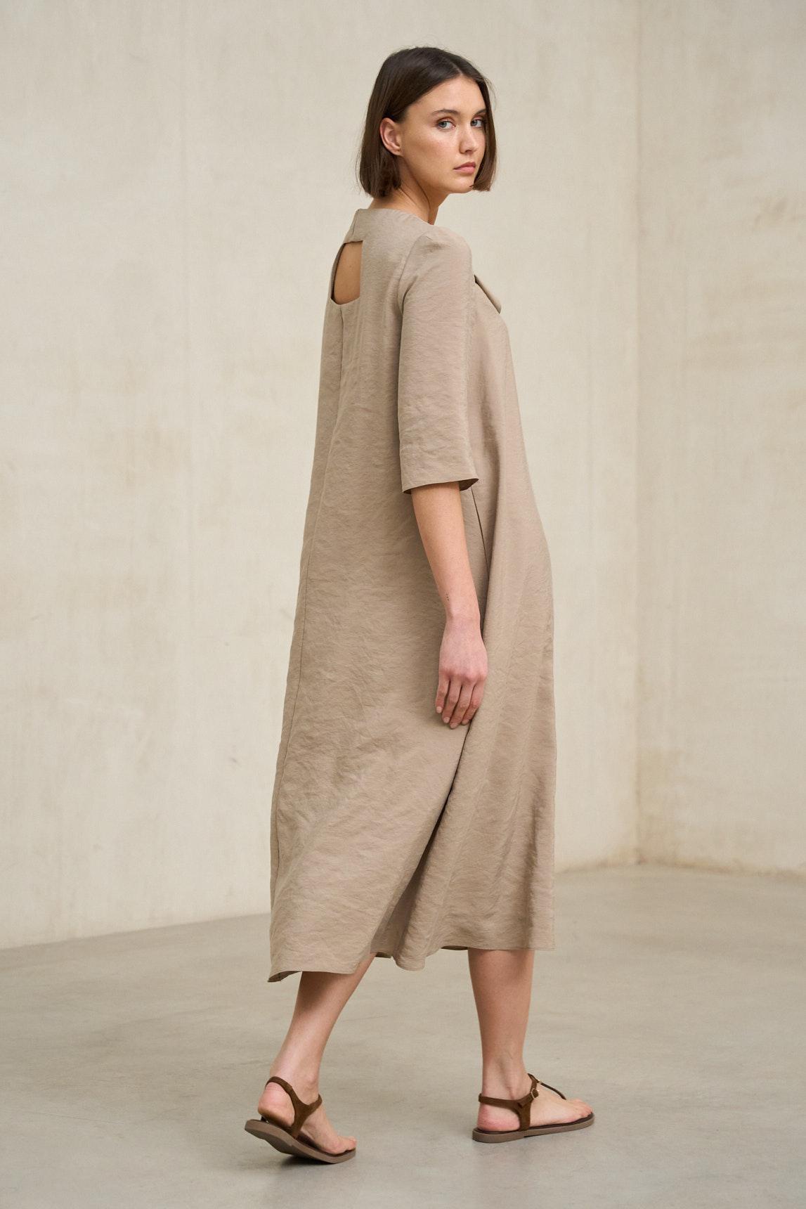 El tonoarena mojada refuerza su versatilidad dentro de la paleta neutra de la colección, combinando con facilidad con accesorios en cuero natural, dorado suave o tonos tierra. Puede llevarse con sandalias planas para un look relajado o elevarse con cuñas y complementos estructurados para comidas, eventos de día o reuniones especiales.