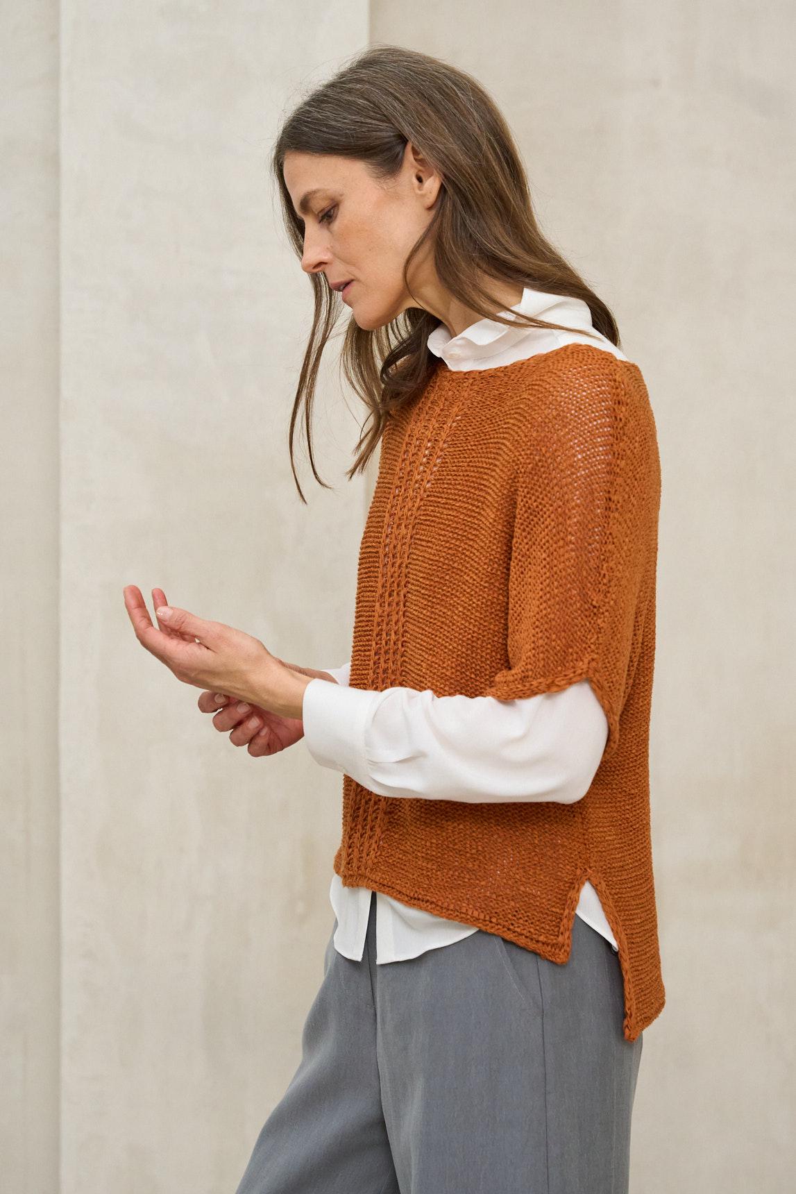 Presenta escote redondo amplio y una silueta recta con caída suave que no marca la figura, favoreciendo un ajuste relajado y elegante. La manga al codo estiliza el brazo y le da un carácter más estructurado que un jersey de manga larga tradicional, convirtiéndolo en una opción versátil tanto para looks informales como para estilismos más cuidados. El tono terracota aporta calidez y profundidad, combinando especialmente bien con blancos rotos, beige, crudos o tonos tierra.