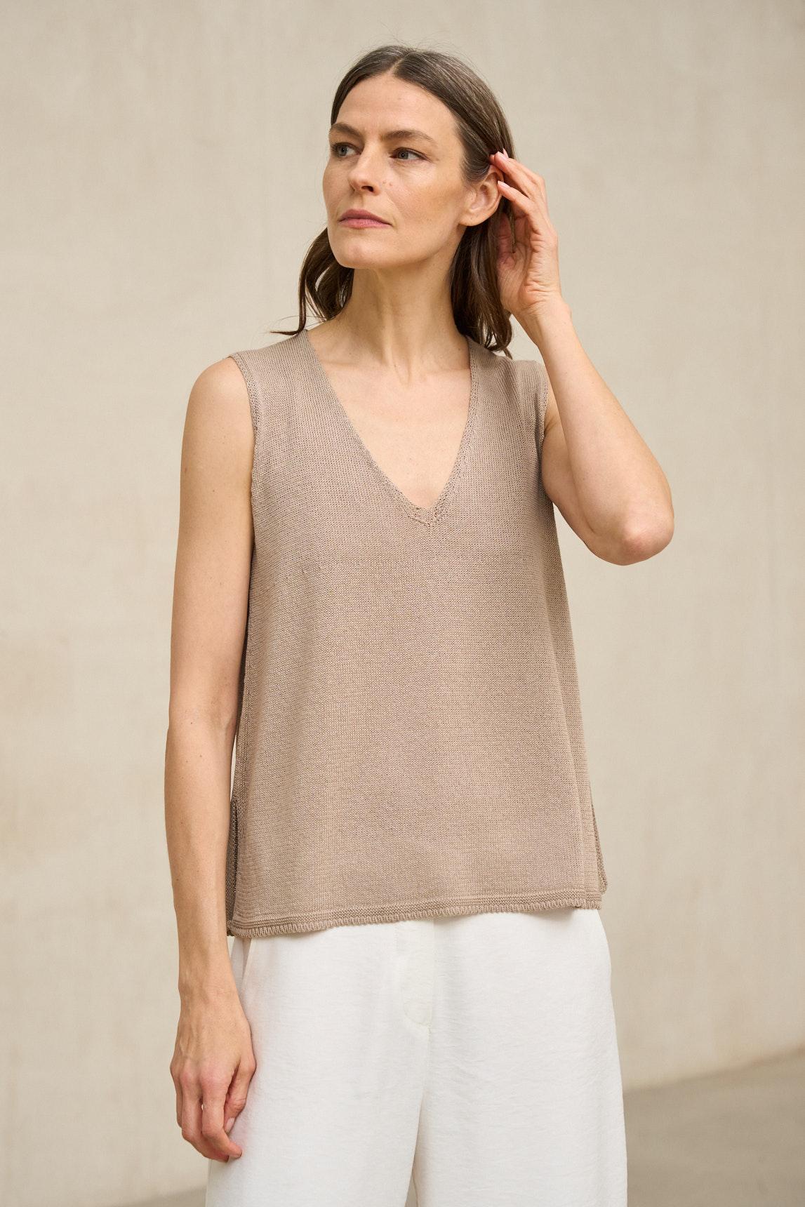 El top de punto Virel arena es una prenda minimalista de líneas limpias que destaca por su silueta depurada y su caída natural. Confeccionado en tejido de punto ligero y suave, presenta escote en pico y diseño sin mangas que estiliza el torso con discreción. Su corte recto y fluido permite que la prenda se adapte al cuerpo sin ceñir, aportando comodidad y equilibrio visual. El tono arena, cálido y luminoso, encaja perfectamente dentro de la paleta neutra de la colección y combina con facilidad con crudos, blancos rotos, camel, verde oliva o gris antracita. Ideal como top base para estilismos monocromáticos o como pieza versátil dentro de conjuntos más estructurados, el top de punto Virel arena es una prenda pensada para primavera y verano. Aporta serenidad, sencillez y coherencia al armario diario. Nos esforzamos por mostrar los colores de la forma más fiel posible, pero pueden variar ligeramente respecto a la realidad.