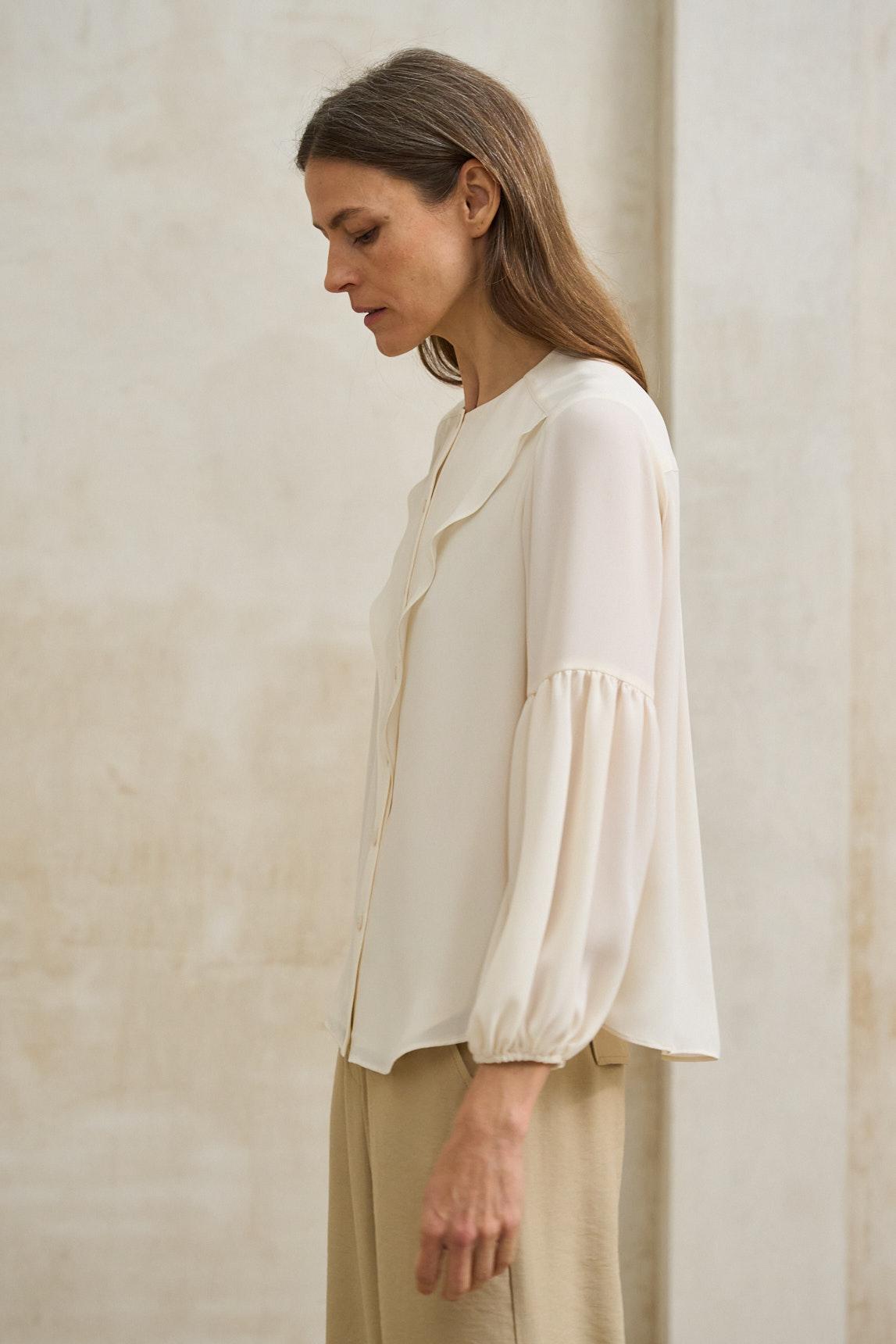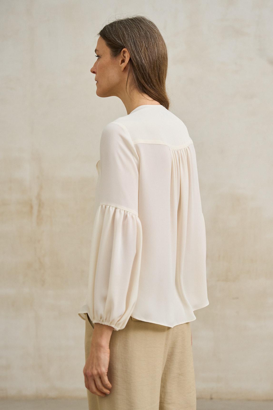 The Mireya off-white blouse is a light and delicate garment, crafted from a semi-sheer fabric that adds movement and subtlety to the design. Its fluid silhouette and soft drape create an elegant and feminine effect, ideal for bright and sophisticated outfits. It features a rounded neckline and slightly puffed long sleeves with elastic cuffs, balancing volume and lightness. The translucent finish of the fabric adds visual depth and allows for layering; we recommend combining it with a T-shirt or top underneath for added coverage. The off-white tone enhances its versatility and makes it an essential piece in a neutral wardrobe. Perfect for pairing with flowy trousers, midi skirts, or light denim, for both casual and more sophisticated looks. We strive to display colors as accurately as possible, but they may vary slightly from reality.