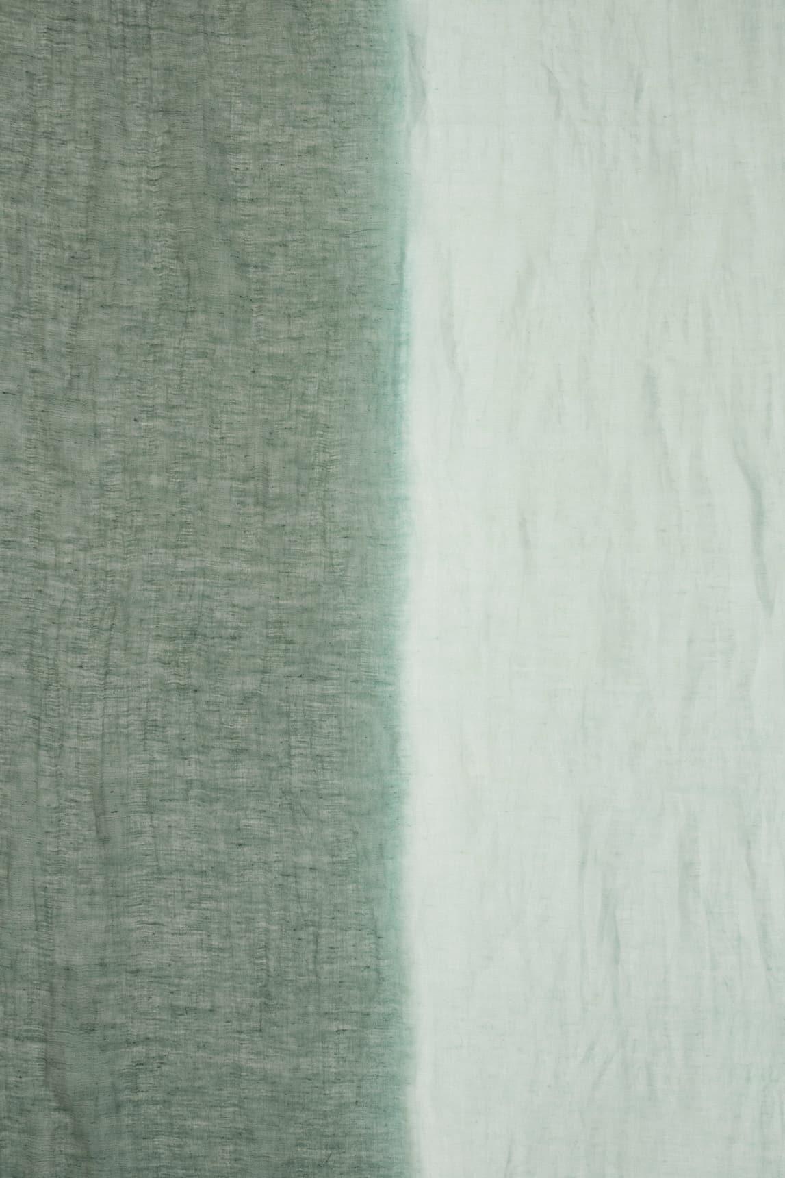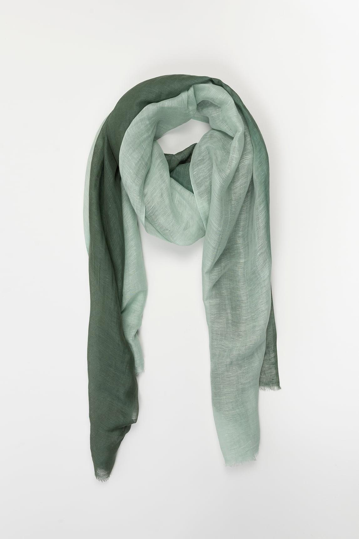 Lightweight scarf made of 70% linen and 30% cotton, with a natural texture and fluid drape. It features a soft gradient that transitions from mint green to a deeper green, creating a fresh and elegant effect. Fine trims with subtle fraying enhance its handcrafted feel.