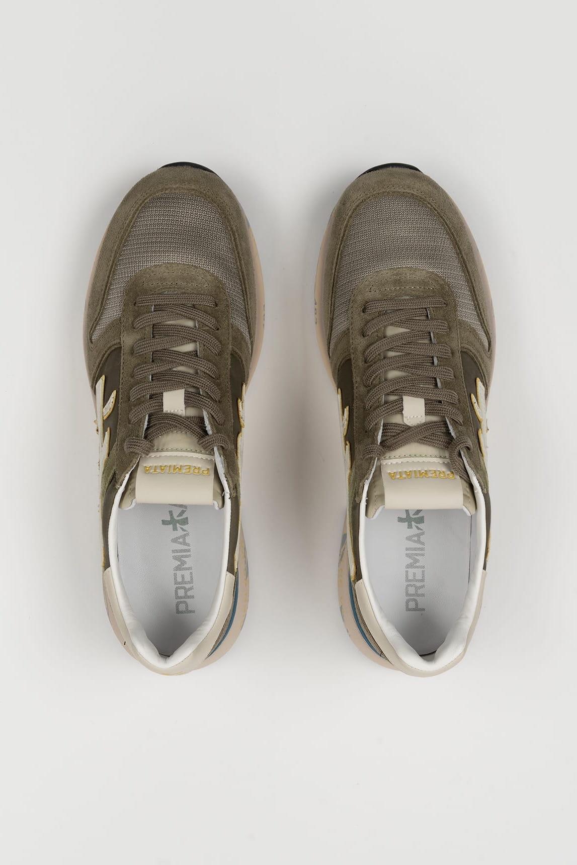 The Premiata Mick 8086 features a combination of beige and soft green tones that reinforces its natural and versatile character. The design blends suede and technical fabric to create a lightweight silhouette with a sophisticated presence. The side logo and the signature graphic sole reinforce the Italian brand's identity. Their comfortable, cushioned construction makes them a practical choice without sacrificing style. A perfect model for relaxed, urban-inspired looks, bringing a balance between sport and elegance. We strive to display colors as accurately as possible, but they may vary slightly from reality.