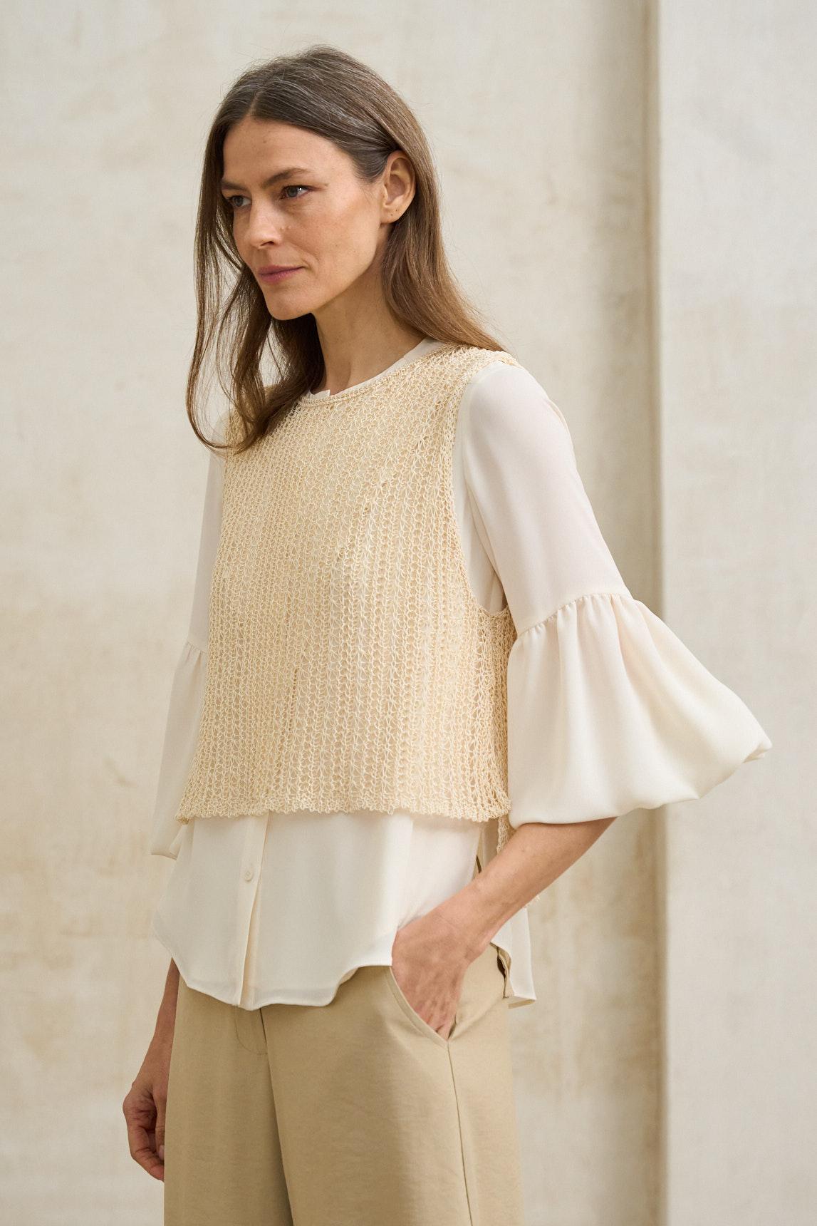 Para un acabado armónico, recomendamos combinarlo con el Top Alenia blanco roto (no incluido), que funciona como base perfecta bajo este tipo de tejidos abiertos. El tono crudo refuerza su versatilidad, permitiendo integrarlo en estilismos neutros junto a arena, beige, camel o verde oliva. Una pieza ideal para primavera y verano que aporta textura, ligereza y un aire artesanal refinado.
