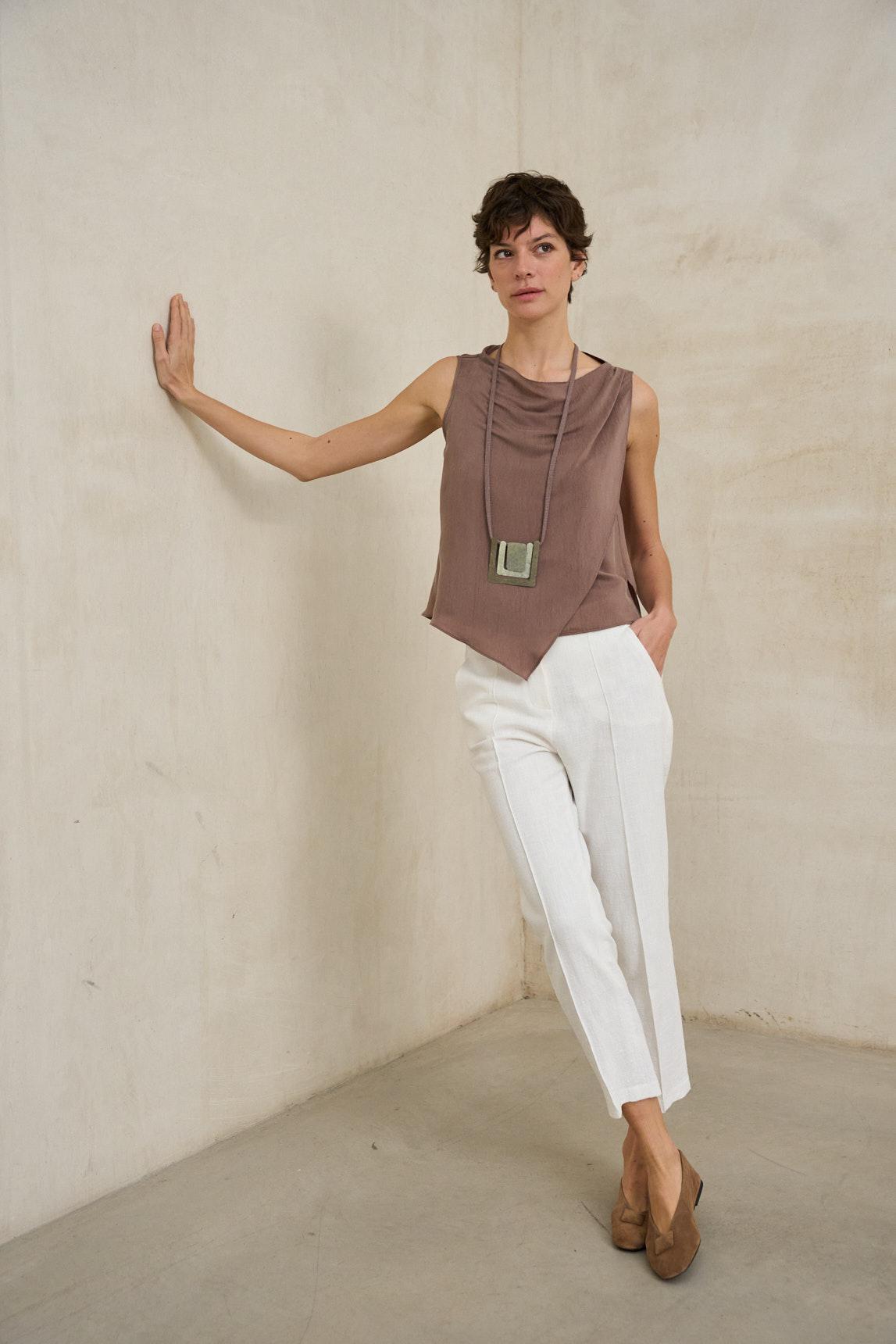 El top Calina Topo suave es una prenda femenina y ligera, diseñada para aportar naturalidad y sofisticación a los looks de verano. Su tejido fluido con caída delicada envuelve el cuerpo sin ceñirse, creando una silueta favorecedora y relajada. Presenta escote suavemente drapeado que aporta movimiento y un aire elegante sin resultar excesivo. El diseño sin mangas estiliza la figura y lo convierte en una opción ideal para los días cálidos o para combinar bajo chaquetas ligeras y blazers. El tono Topo suave, cálido y versátil, combina especialmente bien con blancos rotos, crudos, arena o marrones, aportando profundidad al conjunto sin perder equilibrio. Nos esforzamos por mostrar los colores de la forma más fiel posible, pero pueden variar ligeramente respecto a la realidad.