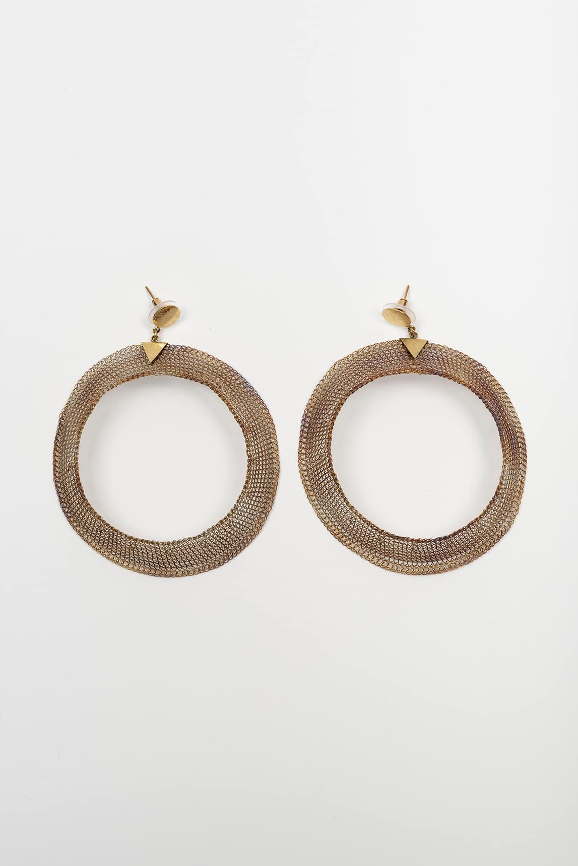 - Pendientes circulares de gran tamaño elaborados en malla metálica con acabado bronce envejecido.