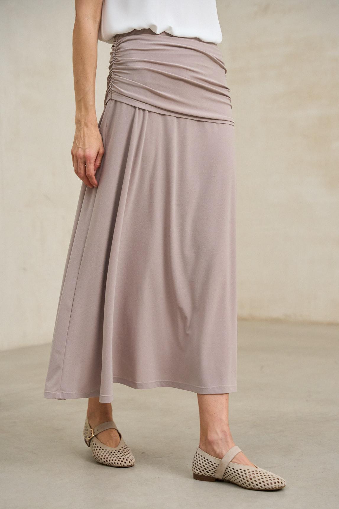 Falda de mujer confeccionada en tejido de punto fluido con un elegante efecto drapeado en la parte superior. Su cintura alta con banda ancha envuelve la silueta aportando comodidad y un ajuste favorecedor. El diseño largo y la caída suave del tejido crean un movimiento natural que realza su carácter sofisticado. La Falda Kaia topo es una prenda versátil y atemporal. Su tono neutro y su acabado fluido permiten combinarla con camisas, tops o chaquetas ligeras, adaptándose con facilidad tanto a looks de día como a estilismos más refinados de noche. Nos esforzamos por mostrar los colores de la forma más fiel posible, pero pueden variar ligeramente respecto a la realidad.