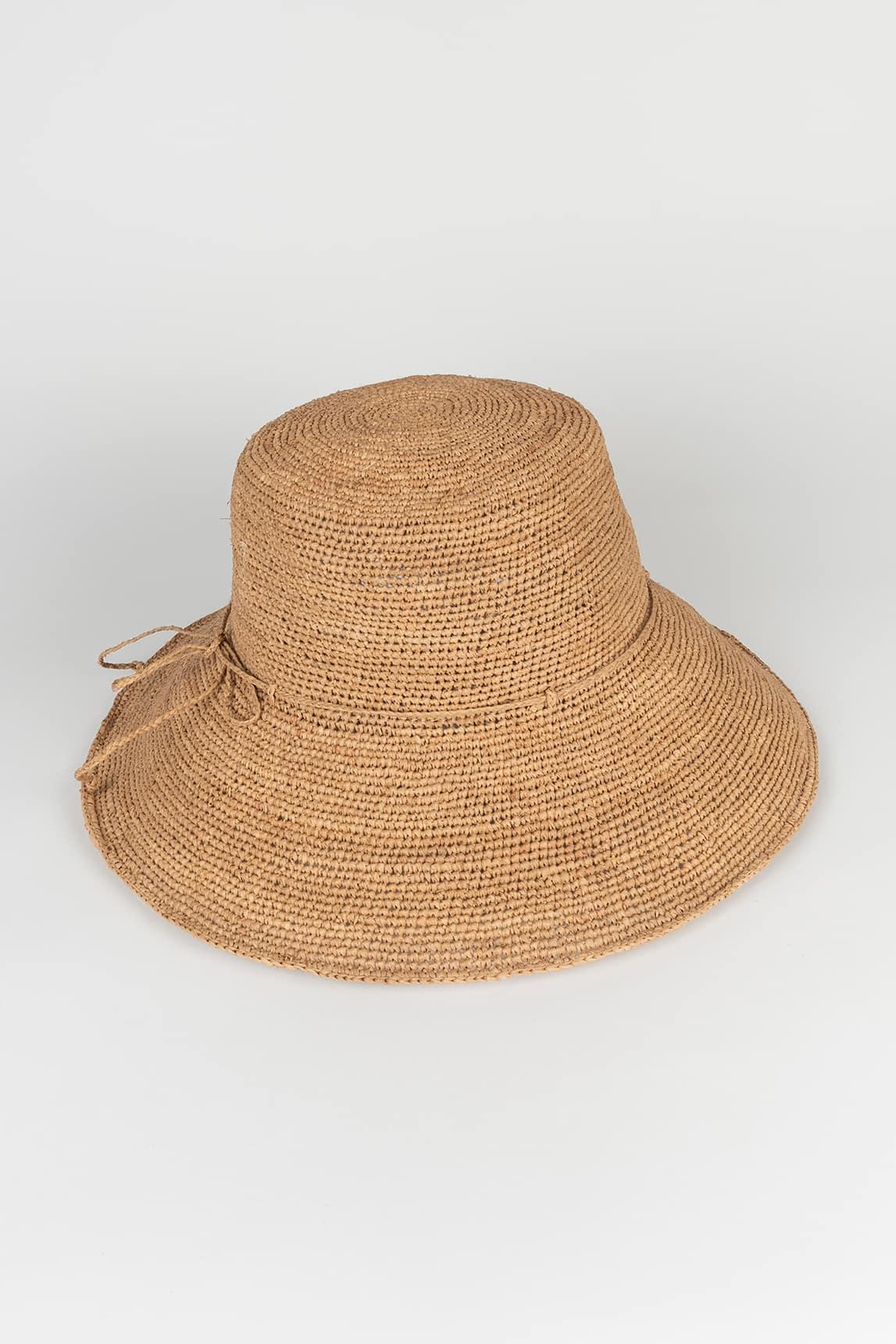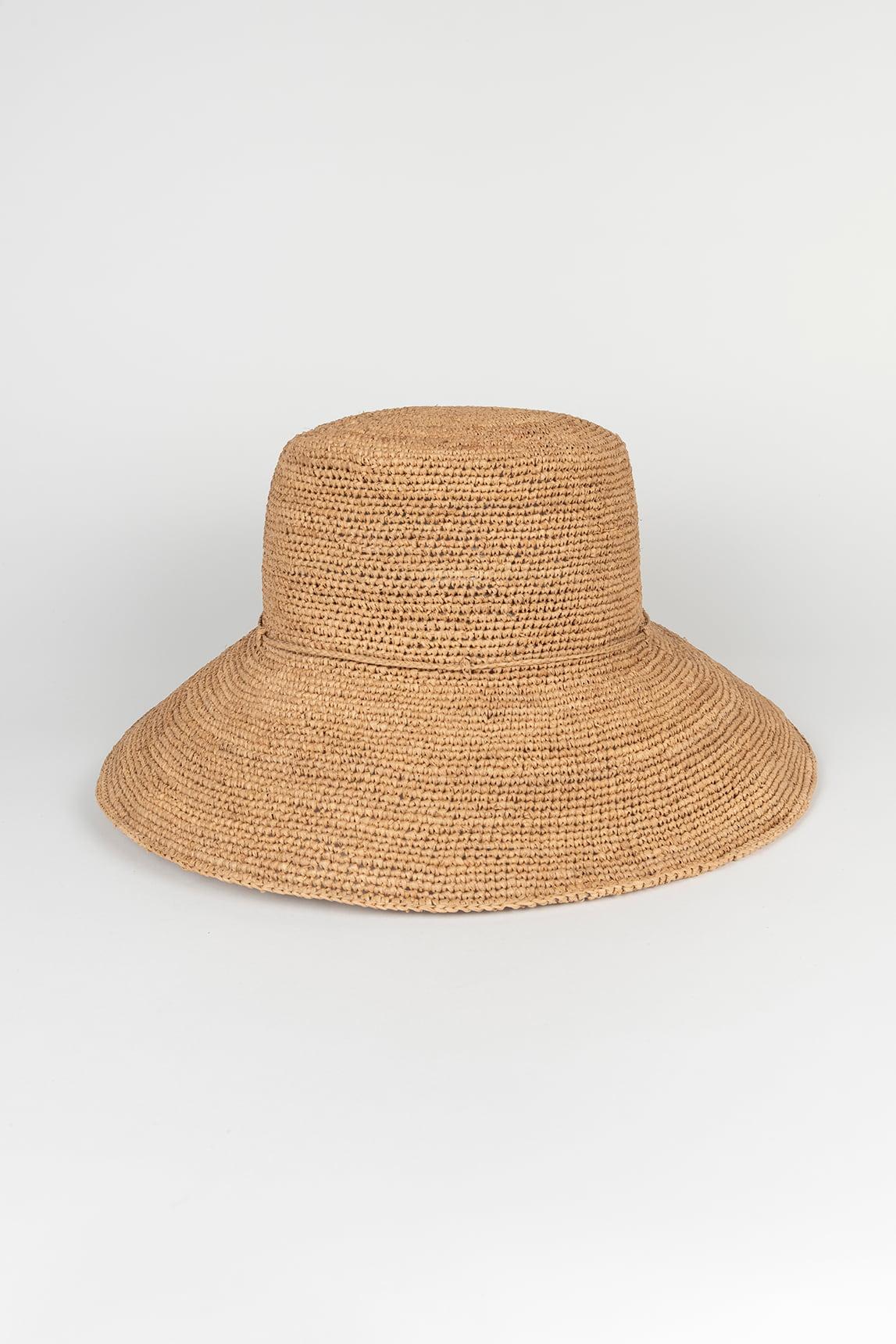 Sombrero de mujer en color camel con silueta tipo campana, copa recta y ala media de caída suave. El diseño presenta una superficie trenzada de aspecto artesanal que aporta textura y ligereza visual, manteniendo una imagen natural, serena y muy favorecedora. Su forma envolvente enmarca el rostro con suavidad y refuerza una estética veraniega de líneas limpias.