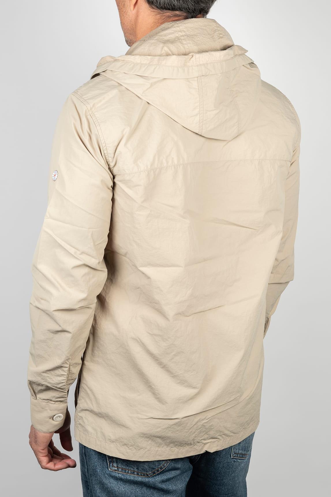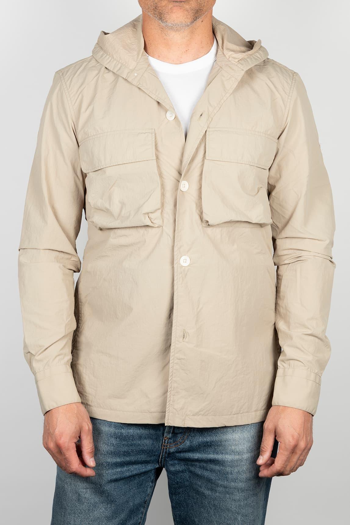 Chaqueta de hombre en color beige con capucha integrada, silueta recta y diseño de inspiración utilitaria. Presenta cierre frontal de botones vistos, manga larga con puño sencillo y bolsillos delanteros de plastrón con solapa, que refuerzan su carácter funcional y relajado. La superficie muestra un acabado liso de apariencia ligera, aportando una imagen limpia y equilibrada muy fácil de combinar.