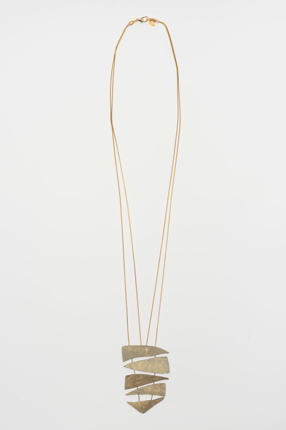 Un collar escultórico que aporta un toque artístico a camisas, jerséis o vestidos lisos. La doble cadena y el colgante texturizado crean un punto focal elegante y fácil de combinar.