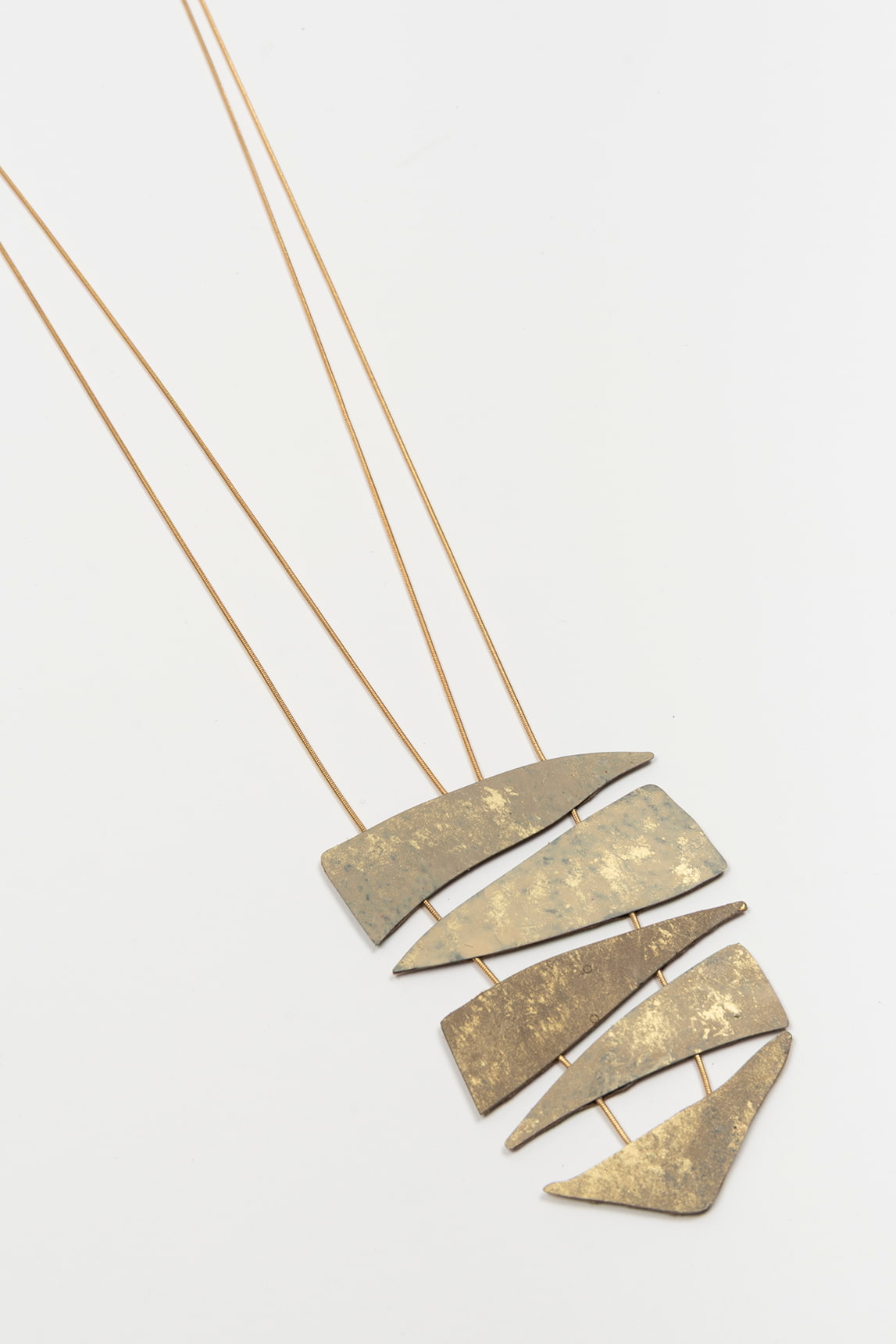 - Colgante geométrico con piezas texturizadas superpuestas.
