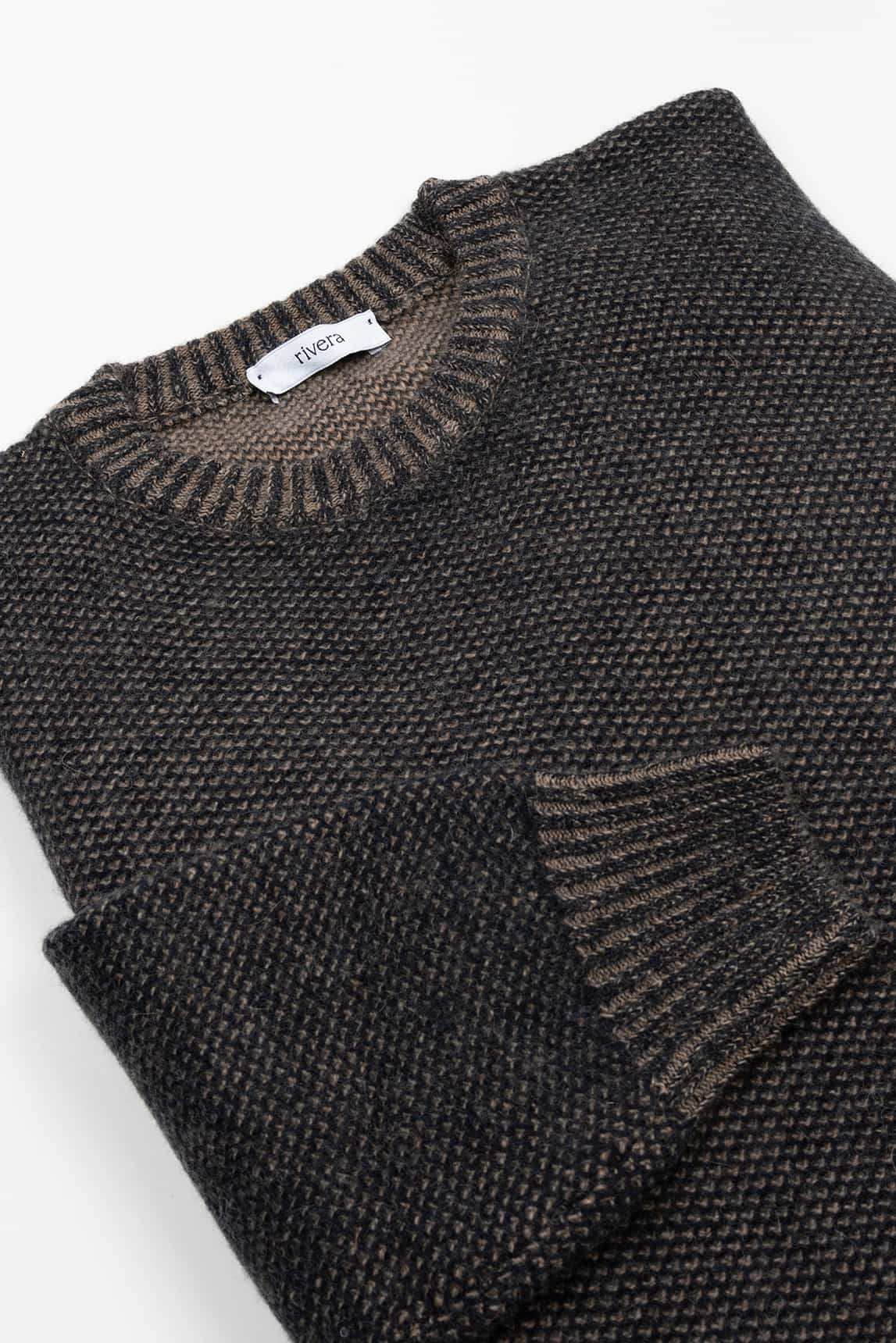 Un básico con carácter: el acabado jaspeado en marrón/negro y el canalé ancho del cuello elevan este jersey versátil que funciona con vaqueros, chinos o debajo de una americana en clave smart-casual.