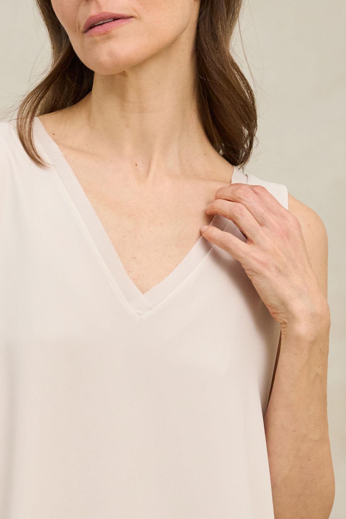Este top sin mangas presenta una silueta fluida con escote en pico tanto en la parte delantera como en la espalda, creando una línea estilizada y ligera. El tejido muestra una caída suave y continua, con un acabado liso y delicado que aporta movimiento natural a la prenda. El bajo ligeramente redondeado suaviza la estructura y refuerza su carácter relajado, mientras que el corte amplio permite que el top se deslice con ligereza sobre el cuerpo sin ceñirse.