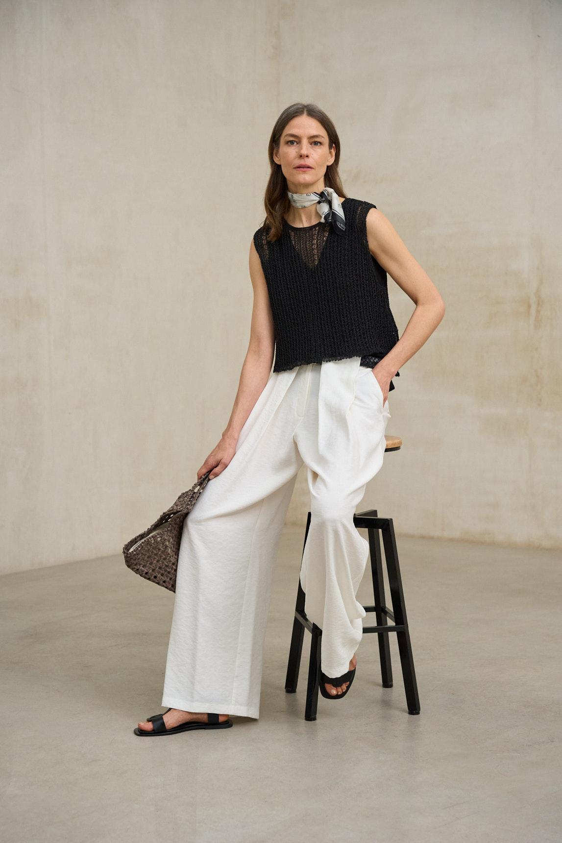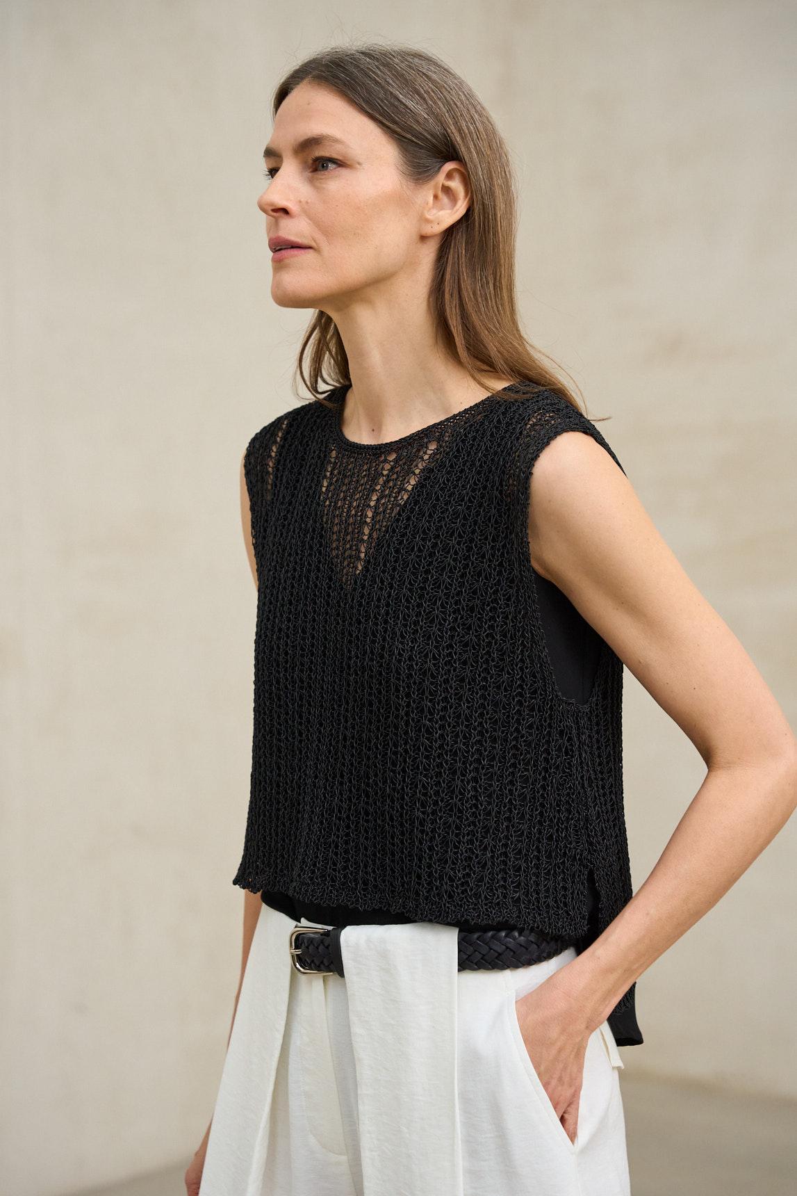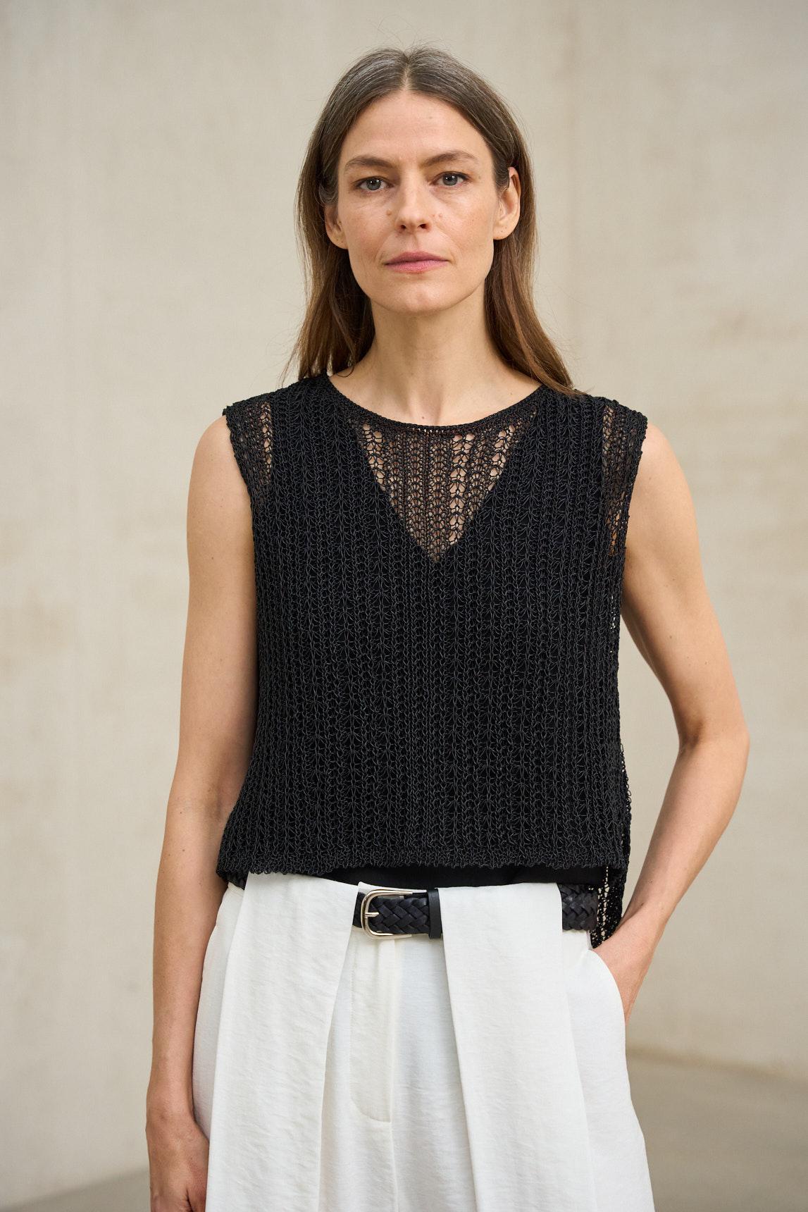 El chaleco Erya negro es una prenda de punto ligero con textura calada que aporta profundidad y carácter al diseño. Su trama abierta genera un efecto visual dinámico y ligeramente etéreo, por lo que se recomienda combinarlo con un top base o camiseta interior (no incluido) para un acabado equilibrado. Presenta escote en pico con detalle de punto más abierto en la parte frontal, que estiliza la zona superior y aporta un matiz delicado al conjunto. El diseño sin mangas y la silueta recta crean una estructura limpia y versátil, ideal para superposición o para llevar como pieza protagonista en estilismos de entretiempo. El tono negro refuerza su elegancia atemporal, facilitando combinaciones con pantalones blancos, tonos neutros o propuestas más sofisticadas en clave monocromática. Una prenda que equilibra sencillez y textura con un aire contemporáneo. Nos esforzamos por mostrar los colores de la forma más fiel posible, pero pueden variar ligeramente respecto a la realidad.