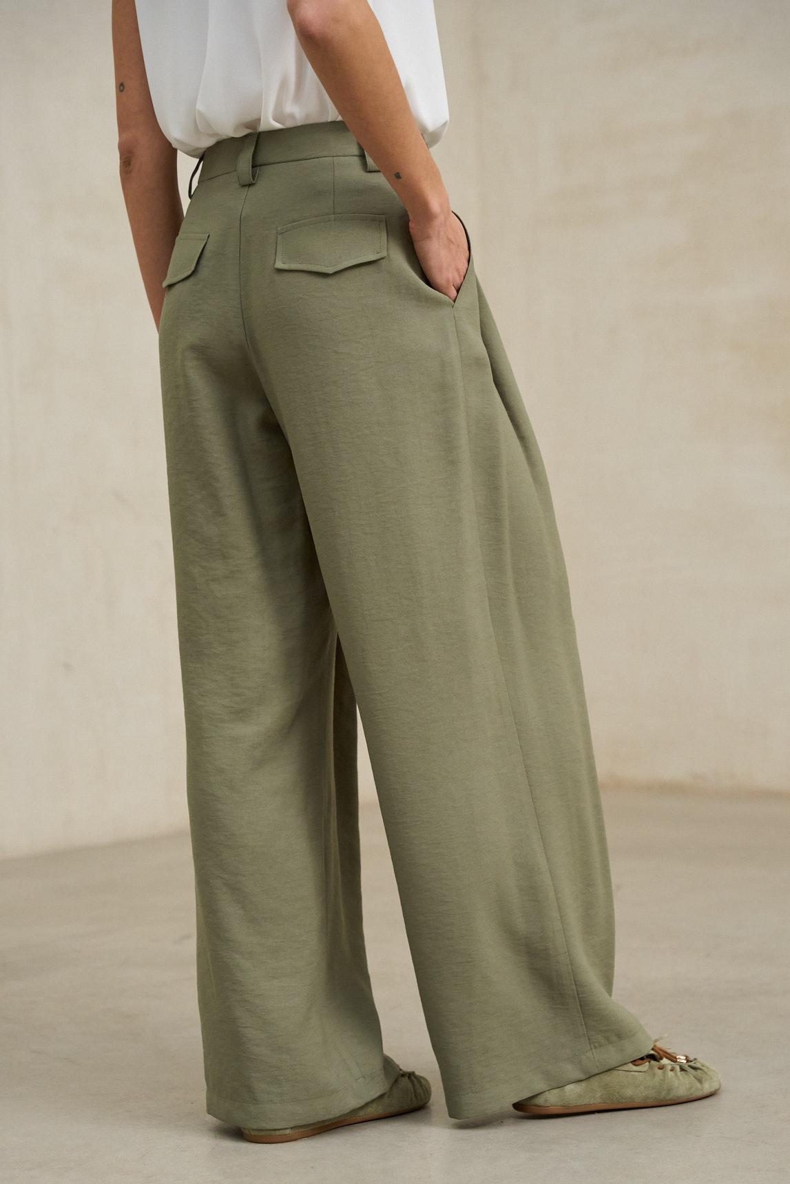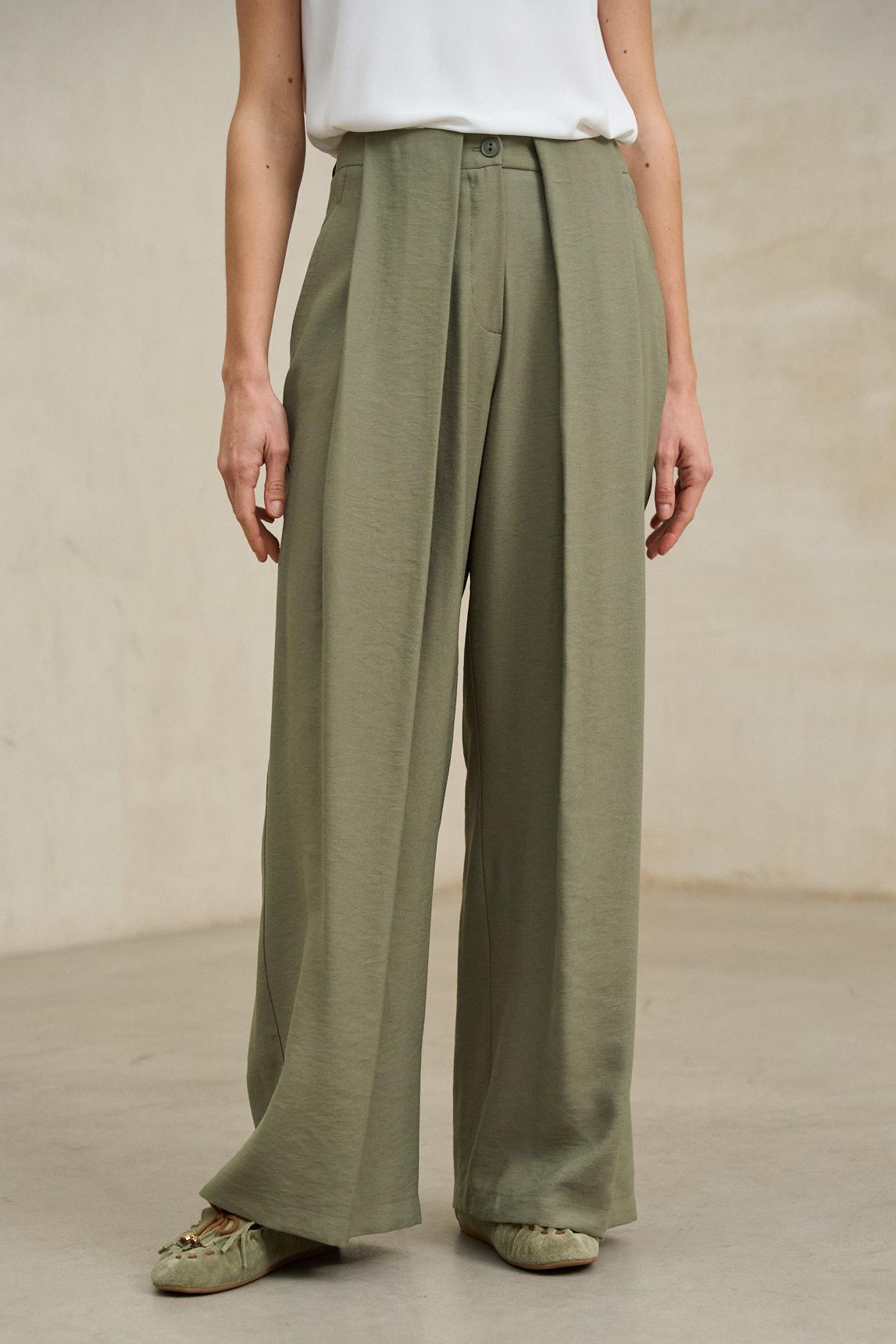 Este pantalón presenta una silueta amplia y recta, definida por pinzas frontales profundas que aportan volumen y una caída fluida desde la cintura. El diseño incorpora cierre frontal con botón visible y una estructura ligera que acompaña el movimiento sin rigidez.