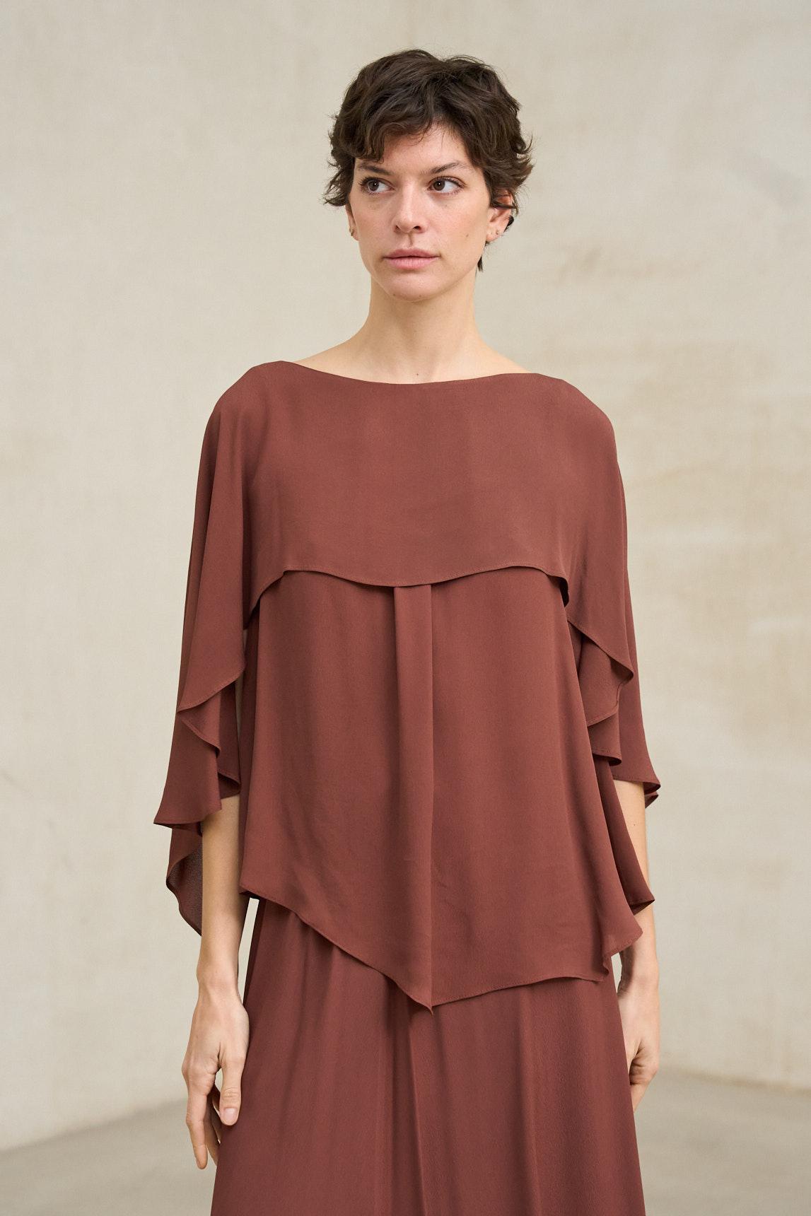 Su diseño incorpora una capa frontal superpuesta que genera volumen y profundidad visual, estilizando la figura sin marcar. El tono teja, cálido y favorecedor, refuerza su carácter elegante y la convierte en una prenda ideal tanto para ocasiones especiales como para estilismos más relajados combinada con pantalones amplios o faldas fluidas.