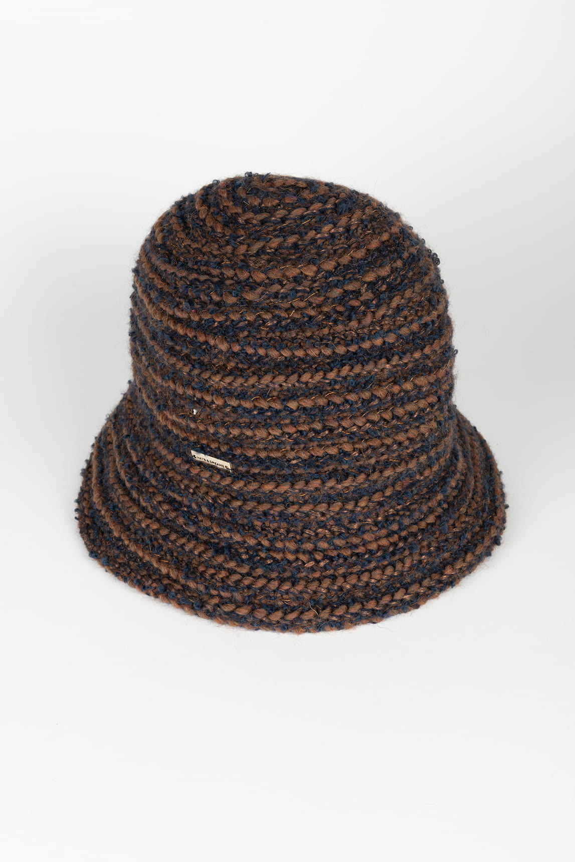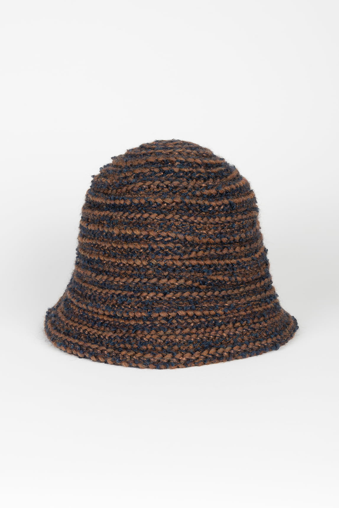 Un sombrero con personalidad gracias a su combinación de hilos marrones y azulados. El tejido bouclé le da una estética rústica y moderna, ideal para quienes buscan diferenciarse con un accesorio único.
